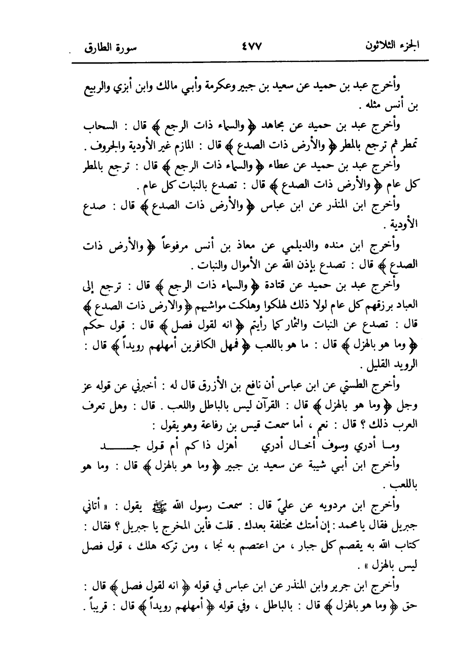 وَأخرج عبد بن حميد عَن مُجَاهِد {وَالسَّمَاء ذَات الرجع} قَالَ: السَّحَاب تمطر ثمَّ ترجع بالمطر {وَالْأَرْض ذَات الصدع} قَالَ: المازم غير الأودية والجروف