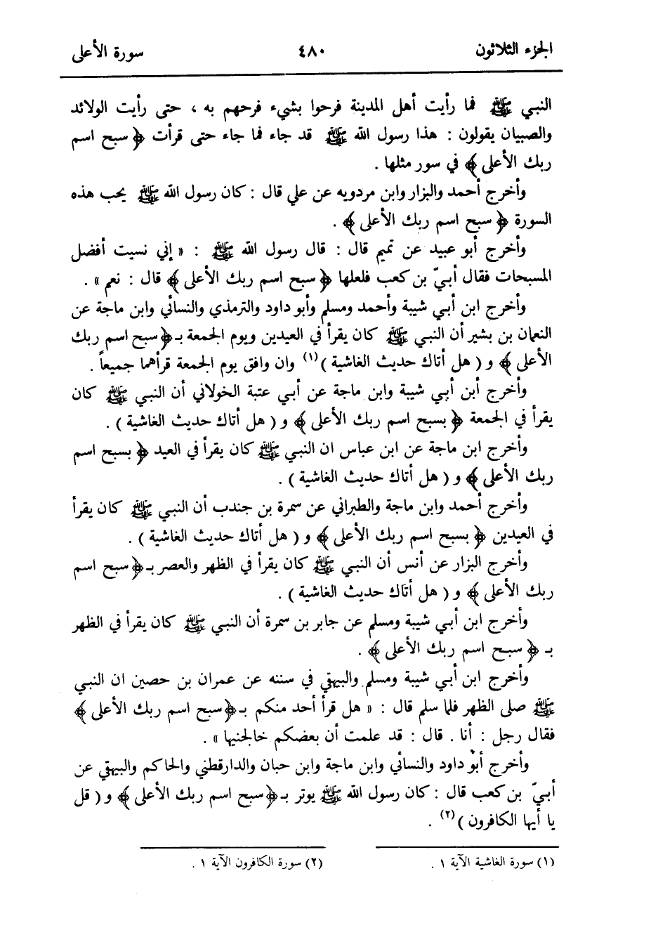 وَأخرج ابْن أبي شيبَة وَأحمد وَمُسلم وَأَبُو دَاوُد وَالتِّرْمِذِيّ وَالنَّسَائِيّ وَابْن ماجة عَن النُّعْمَان بن بشير أَن النَّبِي صلى الله عَلَيْهِ وَسلم كَانَ يقْرَأ فِي الْعِيدَيْنِ وَيَوْم الْجُمُعَة ب {سبح اسْم رَبك الْأَعْلَى} و (هَل أَتَاك حَدِيث الغاشية) (سُورَة الغاشية الْآيَة 1) وَإِن وَافق يَوْم الْجُمُعَة قرأهما جَمِيعًا