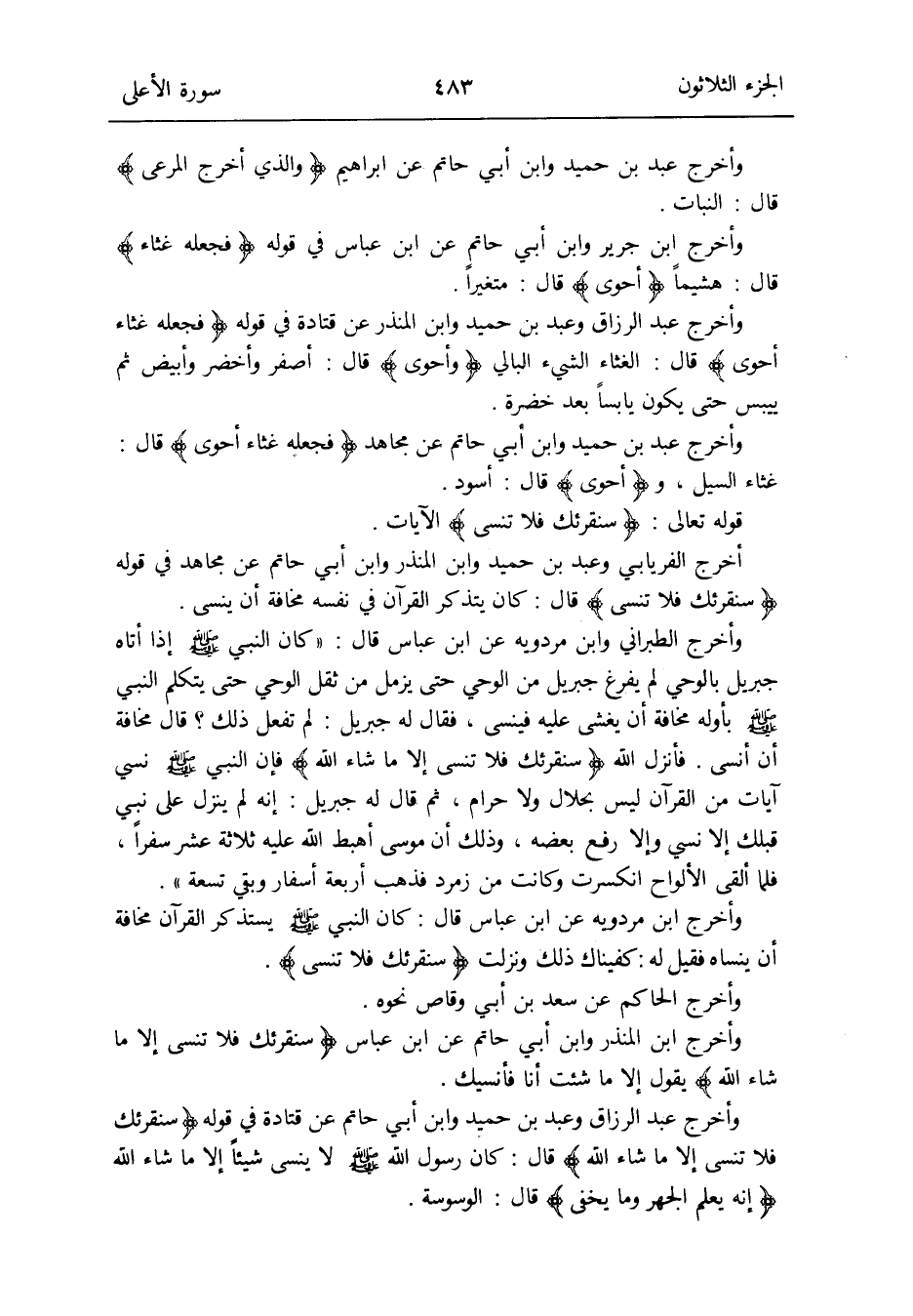 أخرج الْفرْيَابِيّ وَعبد بن حميد وَابْن الْمُنْذر وَابْن أبي حَاتِم عَن مُجَاهِد فِي قَوْله: {سنقرئك فَلَا تنسى} قَالَ: كَانَ يتَذَكَّر الْقُرْآن فِي نَفسه مَخَافَة أَن ينسى