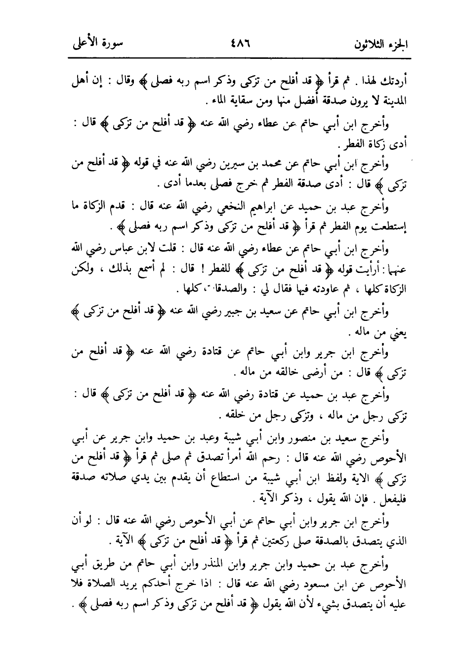وَأخرج ابْن أبي حَاتِم عَن مُحَمَّد بن سِيرِين رَضِي الله عَنهُ فِي قَوْله: {قد أَفْلح من تزكّى} قَالَ: أدّى صَدَقَة الْفطر ثمَّ خرج فصلى بَعْدَمَا أدّى