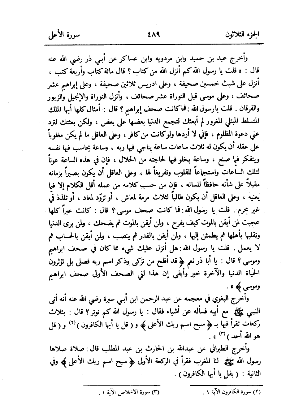 قلت يَا رَسُول الله: هَل أنزل عَلَيْك شَيْء مِمَّا كَانَ فِي صحف إِبْرَاهِيم ومُوسَى قَالَ: يَا أَبَا ذَر نعم {قد أَفْلح من تزكّى وَذكر اسْم ربه فصلى بل تؤثرون الْحَيَاة الدُّنْيَا وَالْآخِرَة خير وَأبقى إِن هَذَا لفي الصُّحُف الأولى صحف إِبْرَاهِيم ومُوسَى}