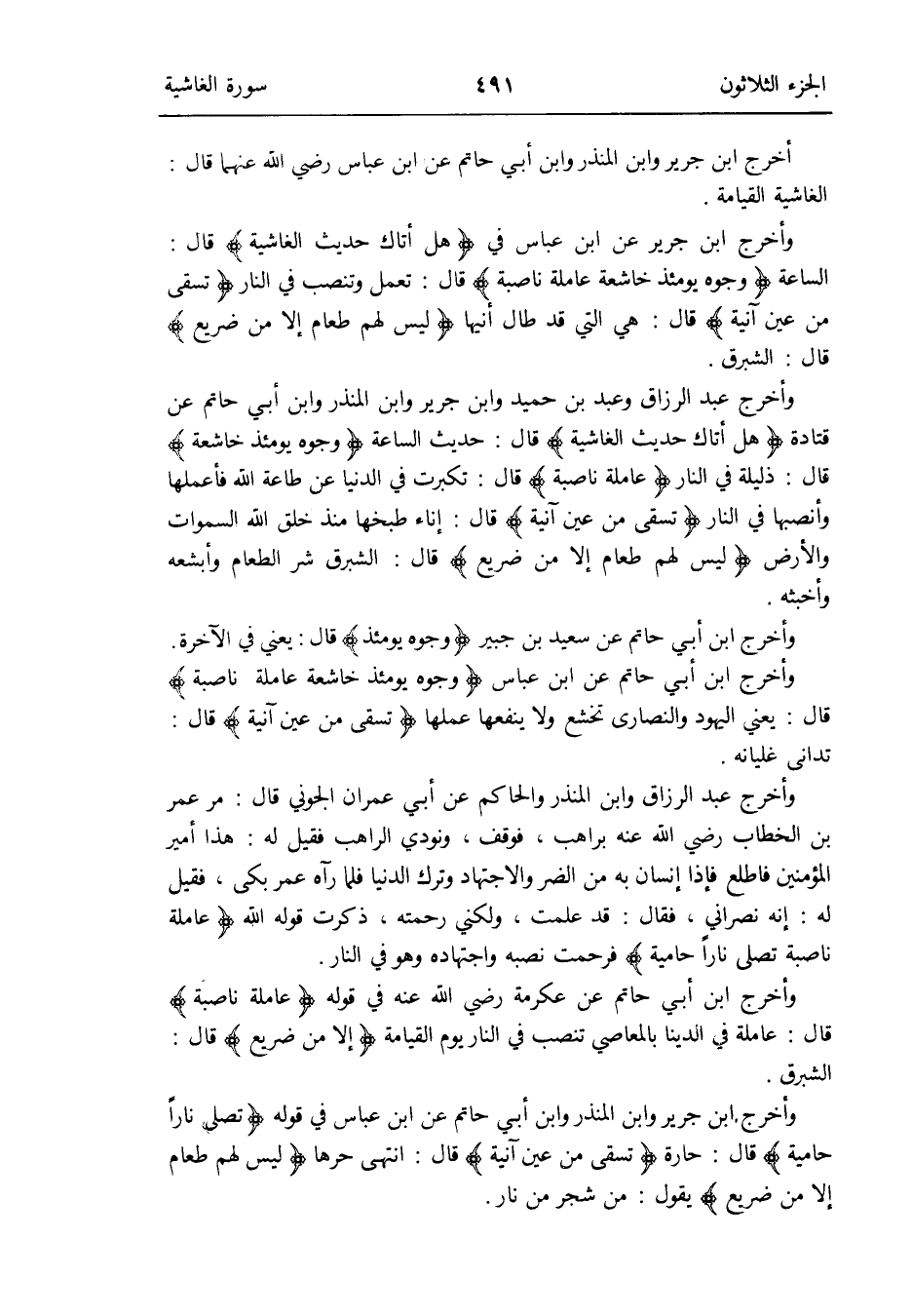وَأخرج ابْن جرير عَن ابْن عَبَّاس فِي {هَل أَتَاك حَدِيث الغاشية} قَالَ: السَّاعَة {وُجُوه يَوْمئِذٍ خاشعة عاملة ناصبة} قَالَ: تعْمل وتنصب فِي النَّار {تسقى من عين آنِية} قَالَ: هِيَ الَّتِي قد طَال أنيها {لَيْسَ لَهُم طَعَام إِلَّا من ضَرِيع} قَالَ: الشبرق