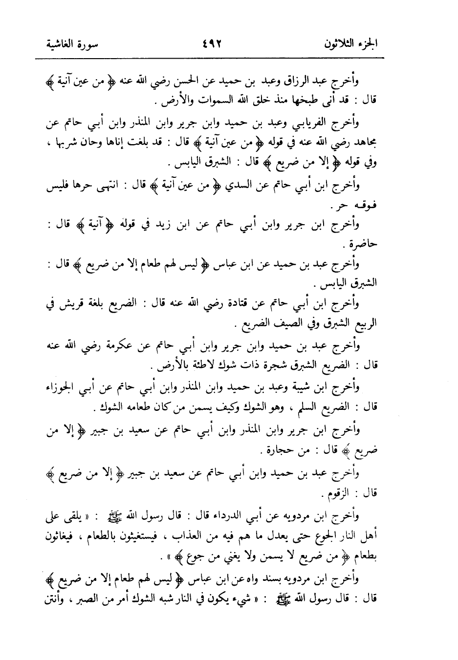 وَأخرج ابْن مرْدَوَيْه بسندٍ واهٍ عَن ابْن عَبَّاس {لَيْسَ لَهُم طَعَام إِلَّا من ضَرِيع} قَالَ: قَالَ رَسُول الله صلى الله عَلَيْهِ وَسلم: شَيْء يكون فِي النَّار شبه الشوك أَمر من الصَّبْر وأنتن