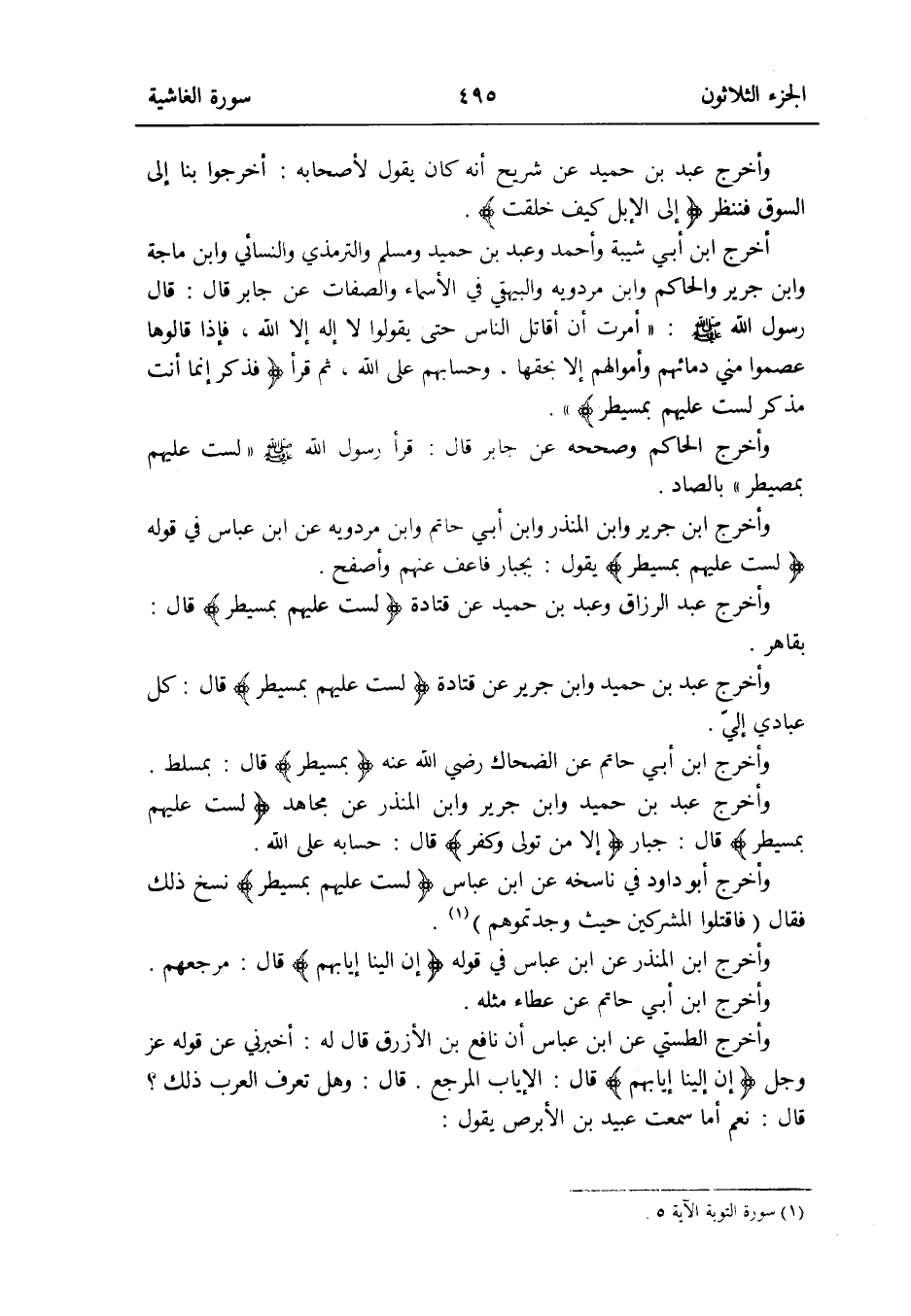 أخرج ابْن أبي شيبَة وَأحمد وَعبد بن حميد وَمُسلم وَالتِّرْمِذِيّ وَالنَّسَائِيّ وَابْن ماجة وَابْن جرير وَالْحَاكِم وَابْن مرْدَوَيْه وَالْبَيْهَقِيّ فِي الْأَسْمَاء وَالصِّفَات عَن جَابر قَالَ: قَالَ رَسُول الله صلى الله عَلَيْهِ وَسلم: أمرت أَن أقَاتل النَّاس حَتَّى يَقُولُوا لَا إِلَه إِلَّا الله فَإِذا قالوها عصموا مني دِمَائِهِمْ وَأَمْوَالهمْ إِلَّا بِحَقِّهَا وحسابهم على الله ثمَّ قَرَأَ {فَذكر إِنَّمَا أَنْت مُذَكّر لست عَلَيْهِم بمصيطر}