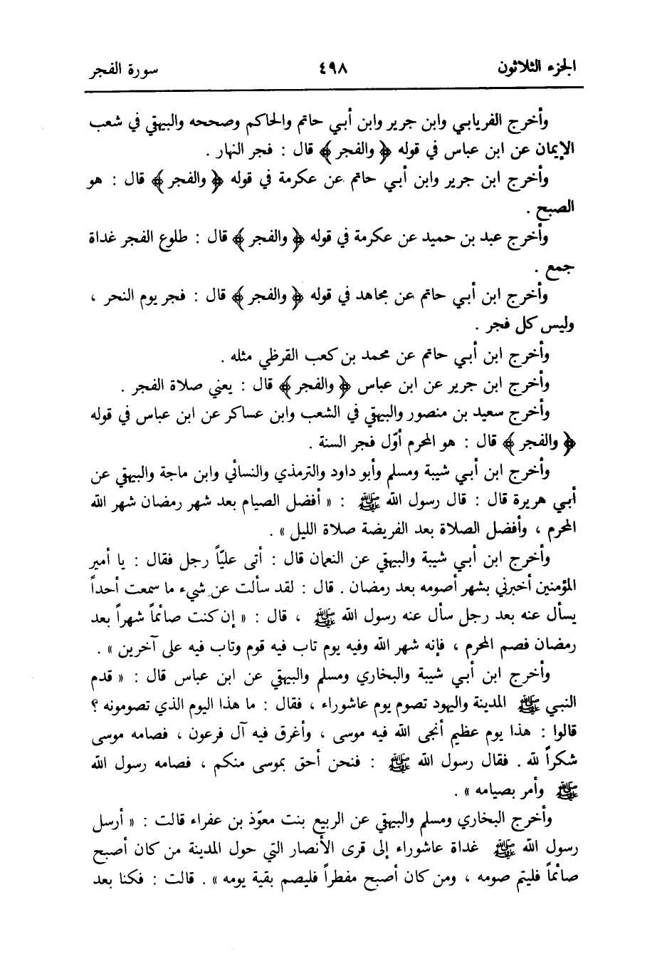وَأخرج الْفرْيَابِيّ وَابْن جرير وَابْن أبي حَاتِم وَالْحَاكِم وَصَححهُ وَالْبَيْهَقِيّ فِي شعب الإِيمان عَن ابْن عَبَّاس فِي قَوْله: {وَالْفَجْر} قَالَ: فجر النَّهَار
