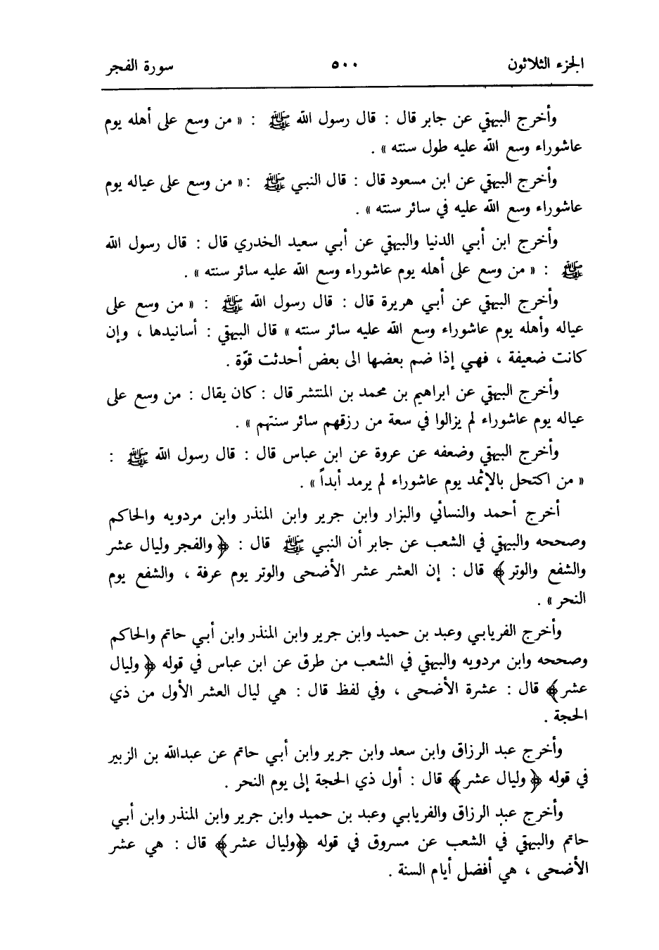 أخرج أَحْمد وَالنَّسَائِيّ وَالْبَزَّار وَابْن جرير وَابْن الْمُنْذر وَابْن مرْدَوَيْه وَالْحَاكِم وَصَححهُ وَالْبَيْهَقِيّ فِي الشّعب عَن جَابر أَن النَّبِي صلى الله عَلَيْهِ وَسلم قَالَ: {وَالْفَجْر وليال عشر وَالشَّفْع وَالْوتر} قَالَ: إِن الْعشْر عشر الْأَضْحَى وَالْوتر يَوْم عَرَفَة وَالشَّفْع يَوْم النَّحْر