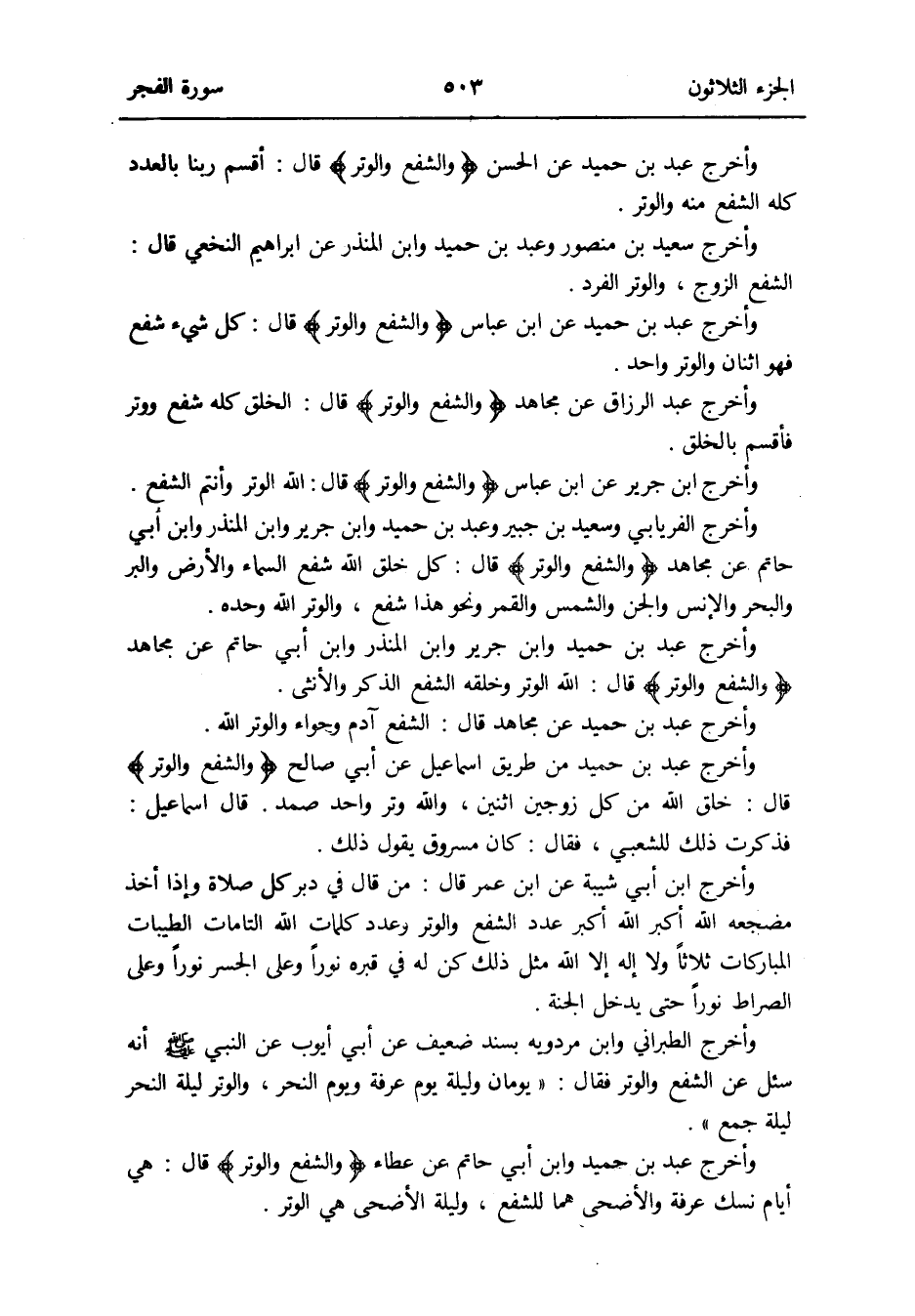 وَأخرج ابْن جرير عَن ابْن عَبَّاس {وَالشَّفْع وَالْوتر} قَالَ: الله الْوتر وَأَنْتُم الشفع
