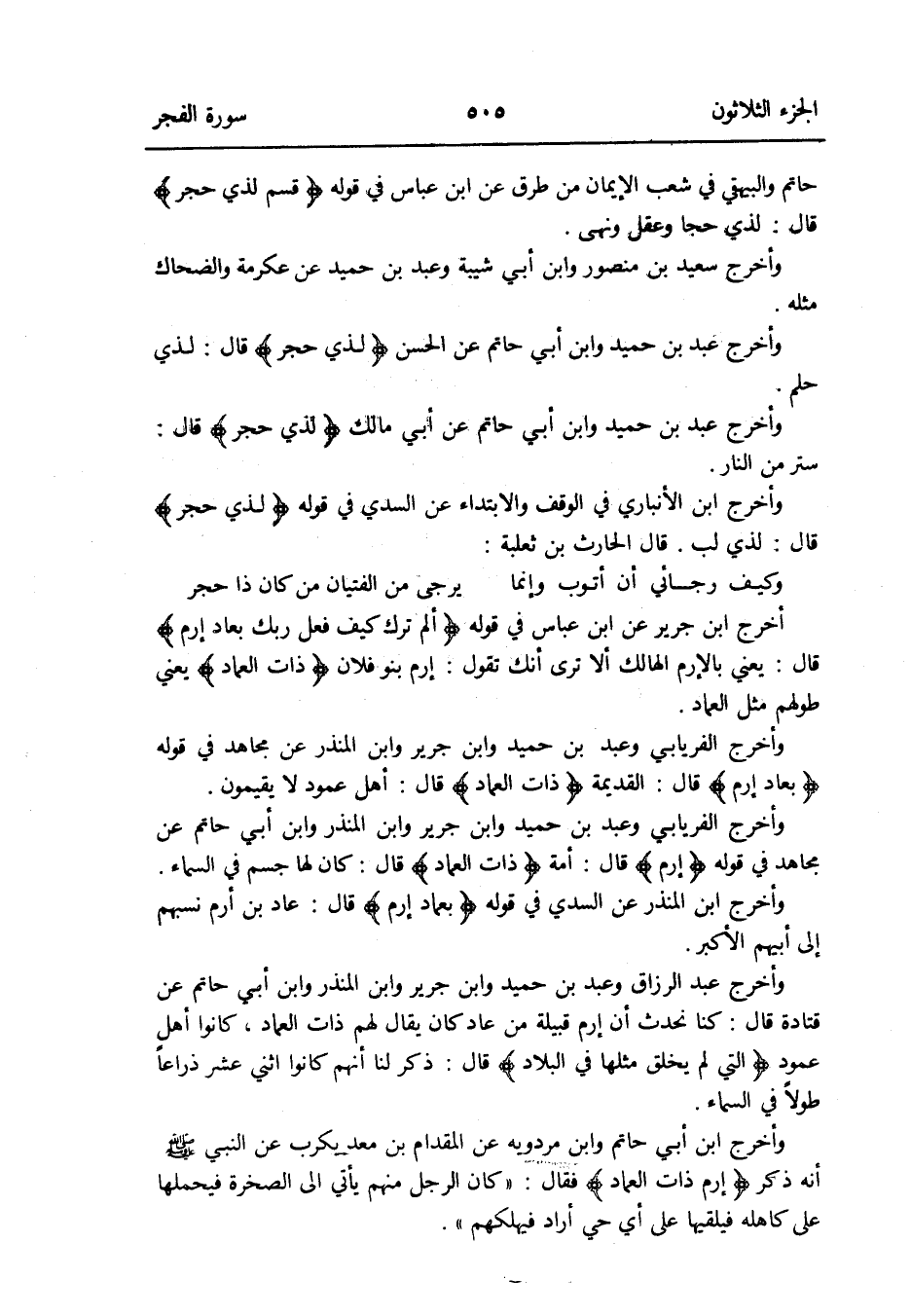 قَالَ الْحَارِث بن ثَعْلَبَة: وَكَيف رجائي أَن أَتُوب وَإِنَّمَا يُرْجَى من الفتيان من كَانَ ذَا حجر أخرج ابْن جرير عَن ابْن عَبَّاس فِي قَوْله: {ألم ترَ كَيفَ فعل رَبك بعاد إرم} قَالَ: يَعْنِي بالإِرم الْهَالِك أَلا ترى أَنَّك تَقول: إرم بَنو فلَان {ذَات الْعِمَاد} يَعْنِي طولهم مثل الْعِمَاد