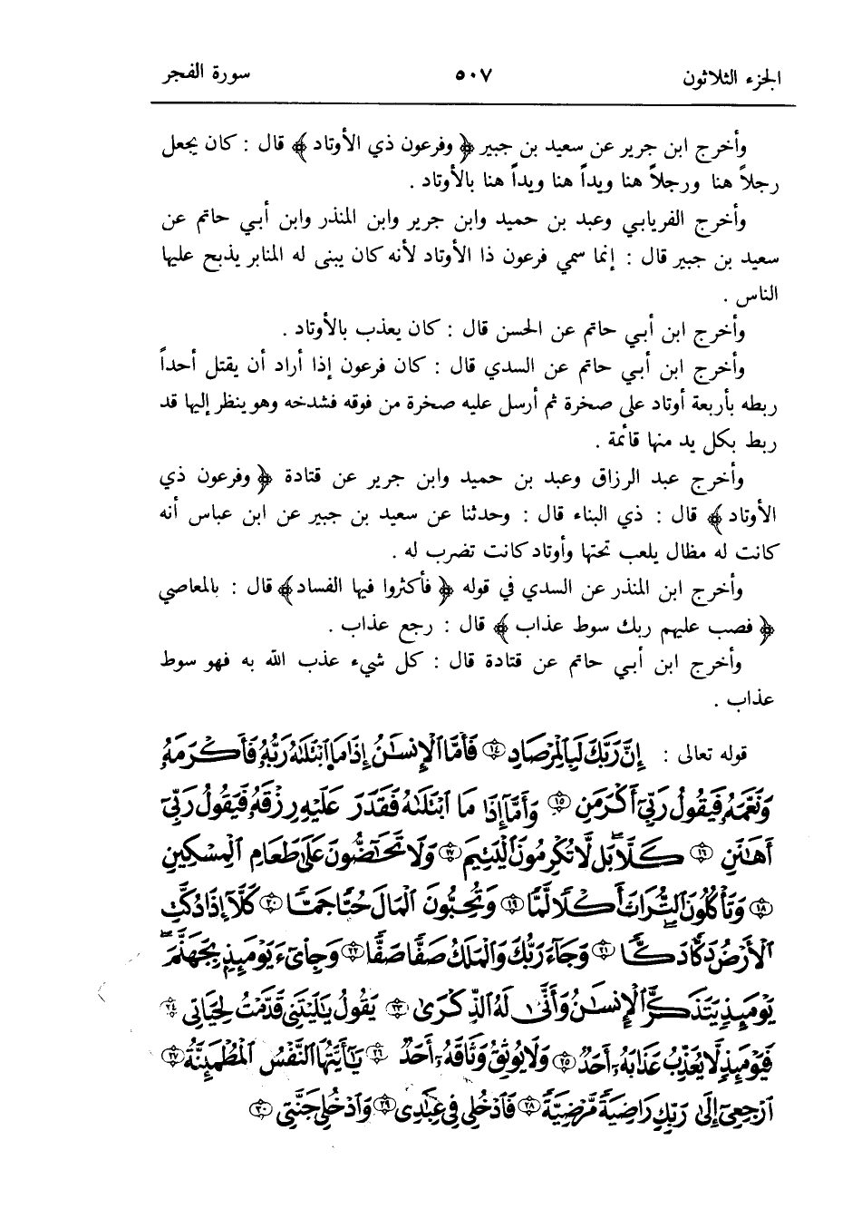 وَأخرج ابْن جرير عَن سعيد بن جُبَير {وَفرْعَوْن ذِي الْأَوْتَاد} قَالَ: كَانَ يَجْعَل رجلا هُنَا وَرِجَال هُنَا ويداً هُنَا ويداً هُنَا بالأوتاد