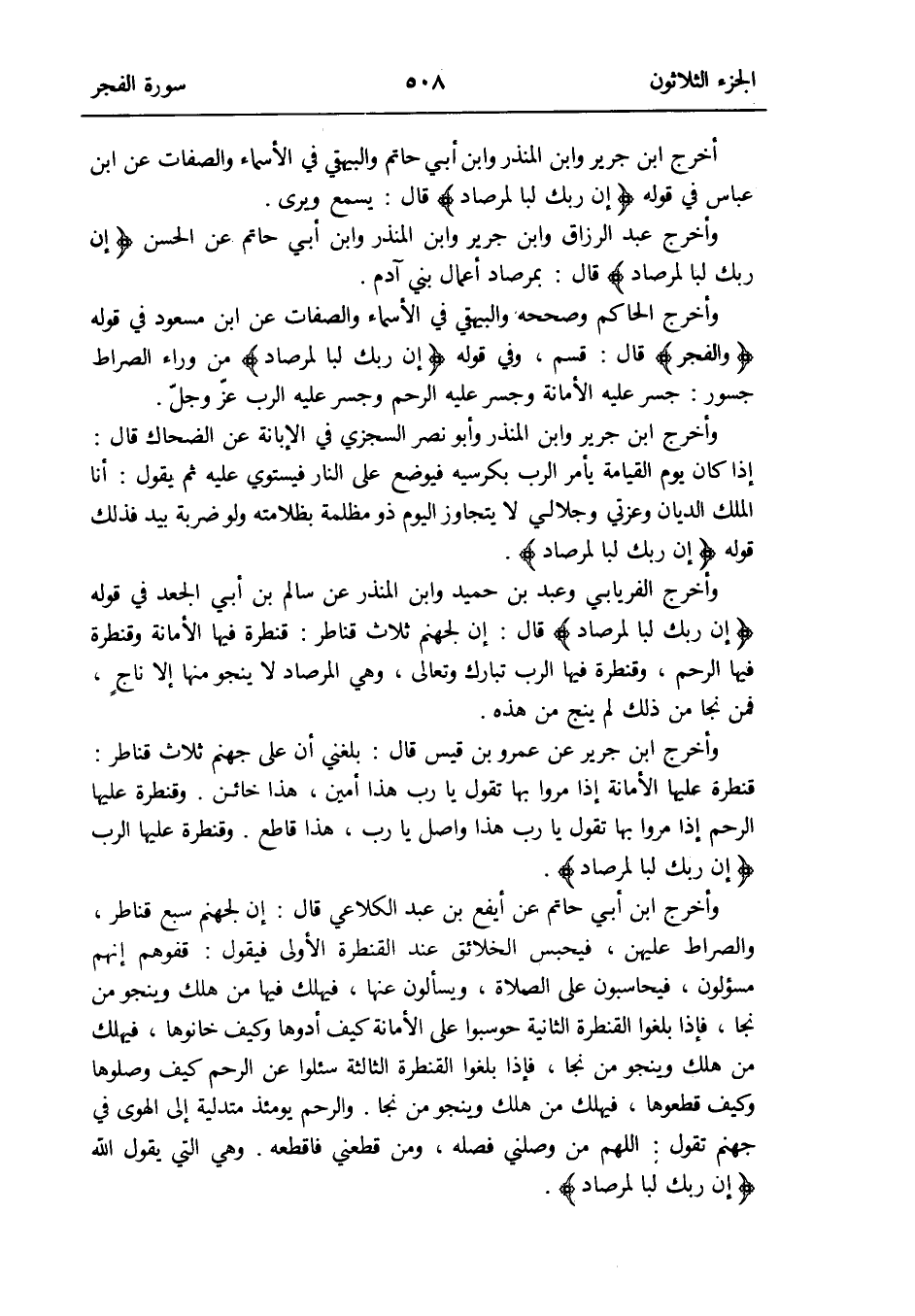 وَأخرج الْحَاكِم وَصَححهُ وَالْبَيْهَقِيّ فِي الْأَسْمَاء وَالصِّفَات عَن ابْن مَسْعُود فِي قَوْله: {وَالْفَجْر} قَالَ: قسم وَفِي قَوْله: {إِن رَبك لبالمرصاد} من وَرَاء الصِّرَاط جسور: جسر عَلَيْهِ الْأَمَانَة وجسر عَلَيْهِ الرَّحِم وجسر عَلَيْهِ الرب عزّ وجلّ