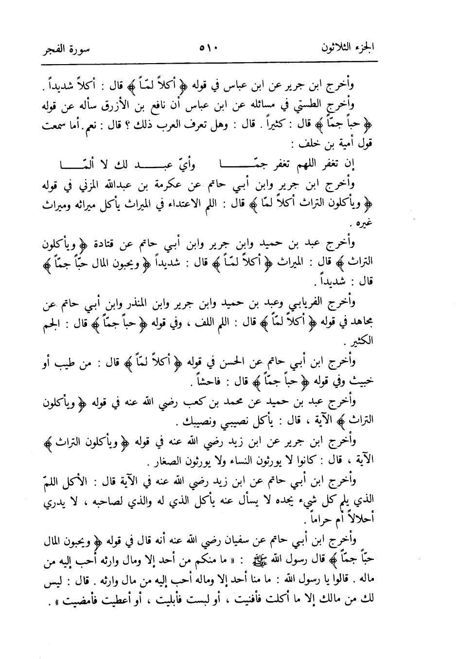 وَأخرج ابْن جرير عَن ابْن زيد رَضِي الله عَنهُ فِي قَوْله: {وتأكلون التراث} الْآيَة قَالَ: كَانُوا لَا يورثون النِّسَاء وَلَا يورثون الصغار