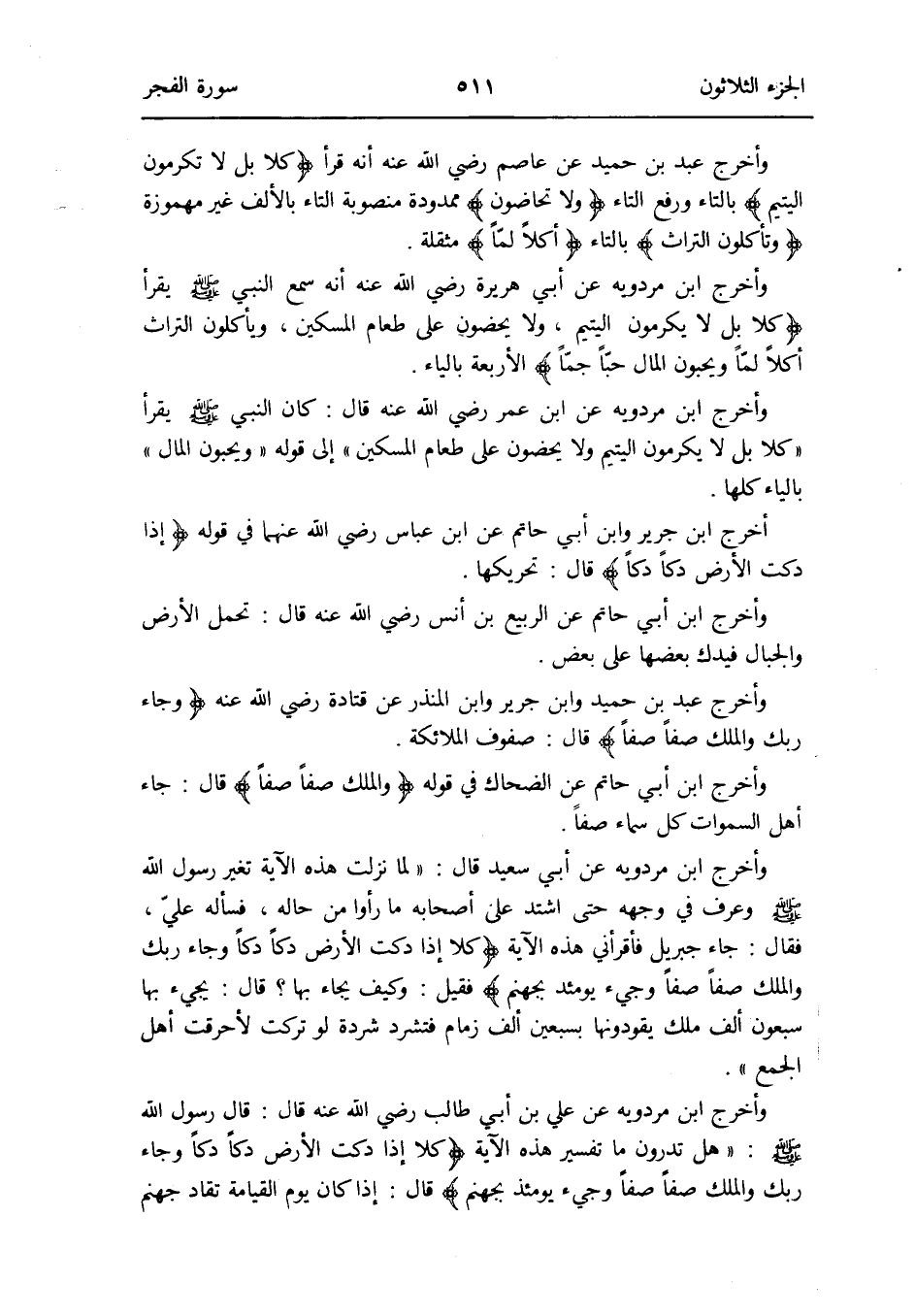 وَأخرج ابْن مرْدَوَيْه عَن أبي هُرَيْرَة رَضِي الله عَنهُ أَنه سمع النَّبِي صلى الله عَلَيْهِ وَسلم يقْرَأ / كلا بل لَا يكرمون الْيَتِيم وَلَا يحضون على طَعَام الْمِسْكِين ويأكلون التراث أكلا لمّاً وَيُحِبُّونَ المَال حبّاً جمّاً / الْأَرْبَعَة بِالْيَاءِ