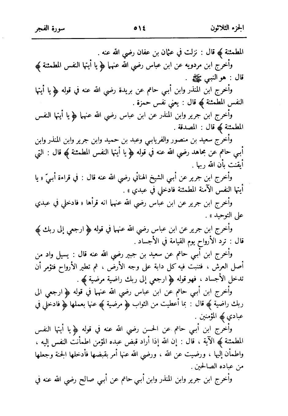 وَأخرج ابْن مرْدَوَيْه عَن ابْن عَبَّاس رَضِي الله عَنْهُمَا {يَا أيتها النَّفس المطمئنة} قَالَ: هُوَ النَّبِي صلى الله عَلَيْهِ وَسلم
