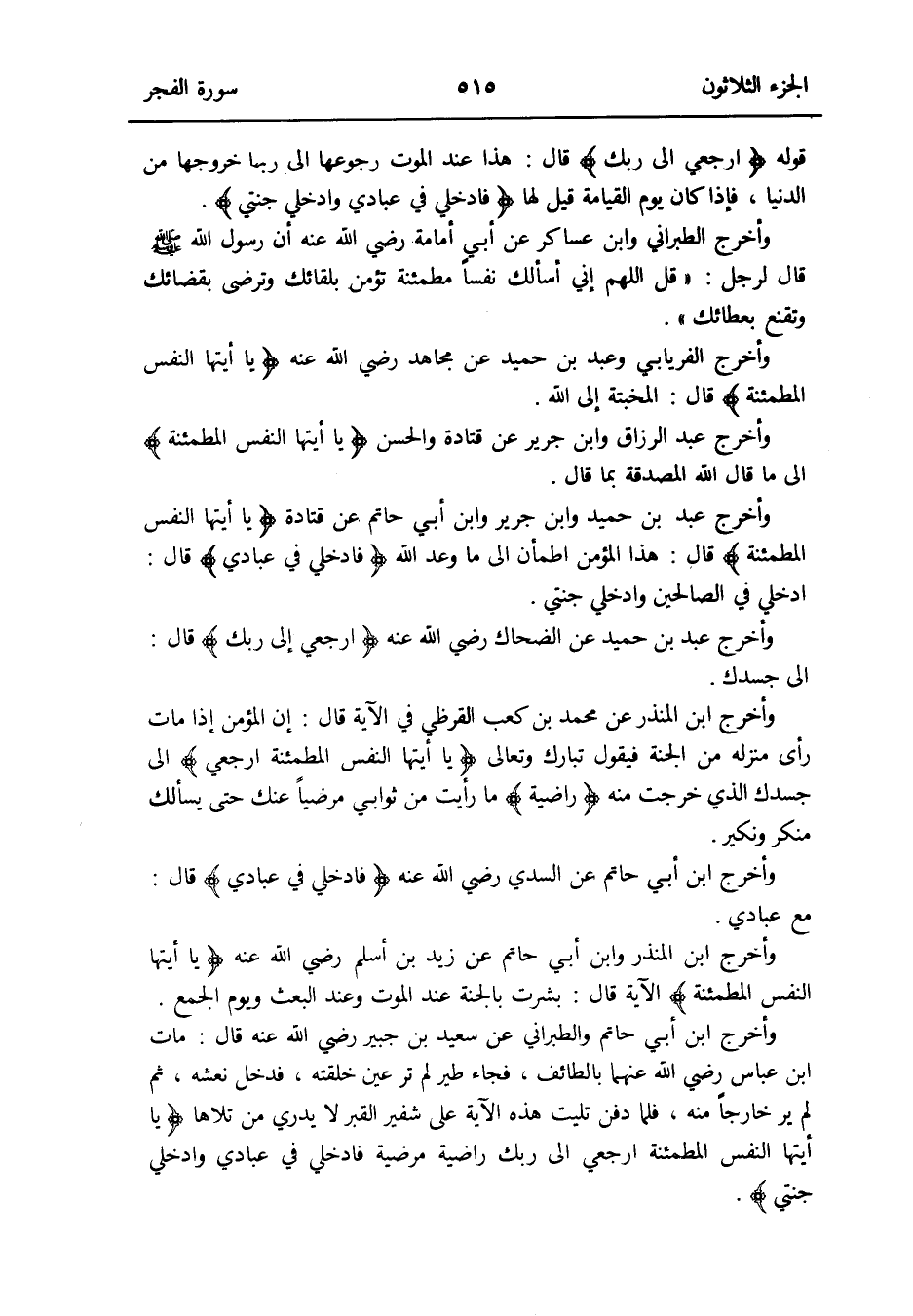 وَأخرج ابْن أبي حَاتِم وَالطَّبَرَانِيّ عَن سعيد بن جُبَير رَضِي الله عَنهُ قَالَ: مَاتَ ابْن عَبَّاس رَضِي الله عَنْهُمَا بِالطَّائِف فجَاء طير لم تَرَ عين خلقته فَدخل نعشه ثمَّ لم ير خَارِجا مِنْهُ فَلَمَّا دفن تليت هَذِه الْآيَة على شَفير الْقَبْر لَا يدْرِي من تَلَاهَا {يَا أيتها النَّفس المطمئنة ارجعي إِلَى رَبك راضية مرضية فادخلي فِي عبَادي وادخلي جنتي}