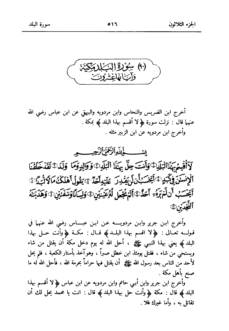 مُقَدّمَة السُّورَة أخرج ابْن الضريس والنحاس وَابْن مرْدَوَيْه وَالْبَيْهَقِيّ عَن ابْن عَبَّاس رَضِي الله عَنْهُمَا قَالَ: نزلت سُورَة {لَا أقسم بِهَذَا الْبَلَد} بِمَكَّة وَأخرج ابْن مرْدَوَيْه عَن ابْن الزبير مثله