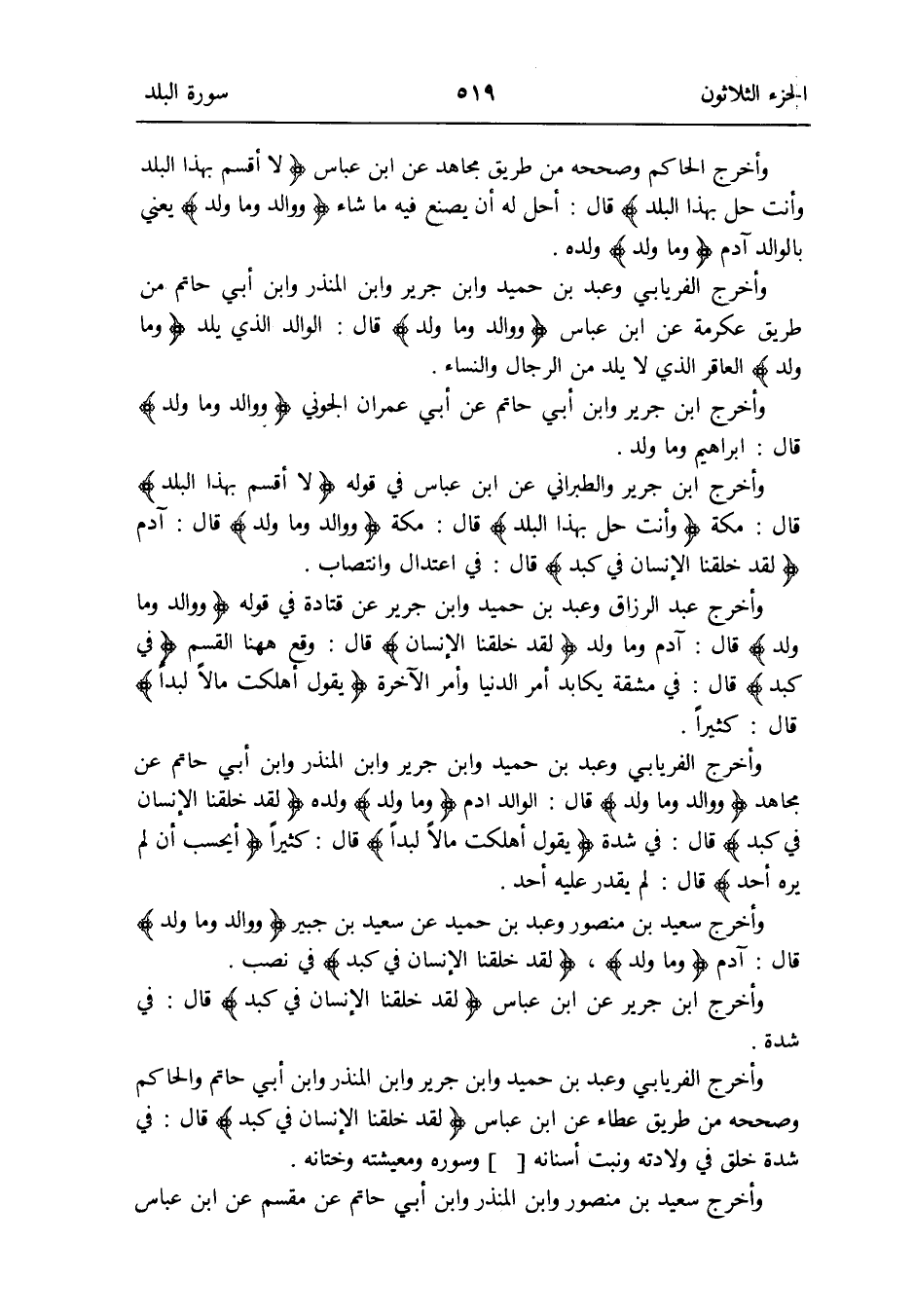 وَأخرج ابْن جرير وَالطَّبَرَانِيّ عَن ابْن عَبَّاس فِي قَوْله {لَا أقسم بِهَذَا الْبَلَد} قَالَ: مَكَّة {وَأَنت حل بِهَذَا الْبَلَد} قَالَ: مَكَّة {ووالد وَمَا ولد} قَالَ: آدم {لقد خلقنَا الإِنسان فِي كبد} قَالَ: فِي اعْتِدَال وانتصاب