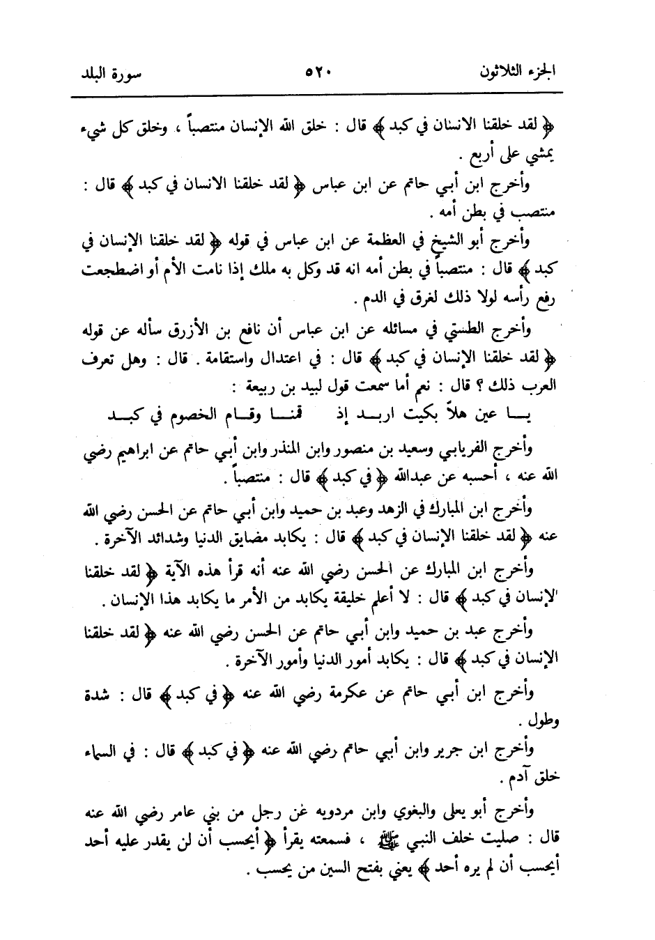 وَأخرج ابْن الْمُبَارك عَن الْحسن رَضِي الله عَنهُ أَنه قَرَأَ هَذِه الْآيَة {لقد خلقنَا الإِنسان فِي كبد} قَالَ: لَا أعلم خَلِيقَة يكابد من الْأَمر مَا يكابد هَذَا الإِنسان