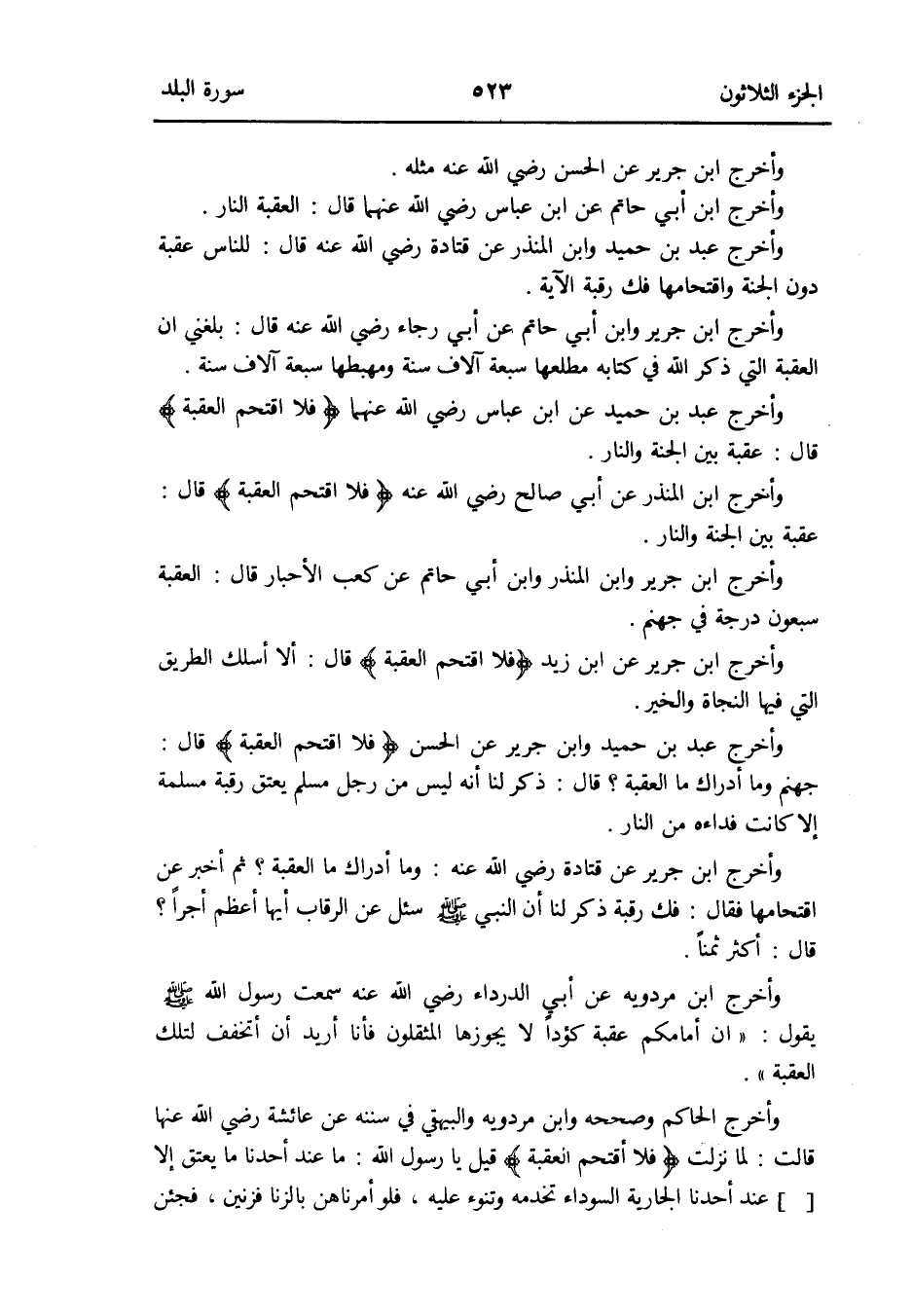 وَأخرج ابْن جرير عَن قَتَادَة رَضِي الله عَنهُ: وَمَا أَدْرَاك مَا الْعقبَة ثمَّ أخبر عَن اقتحامها فَقَالَ: فك رَقَبَة ذكر لنا أَن النَّبِي صلى الله عَلَيْهِ وَسلم سُئِلَ عَن الرّقاب أَيهَا أعظم أجرا قَالَ: أَكثر ثمنا