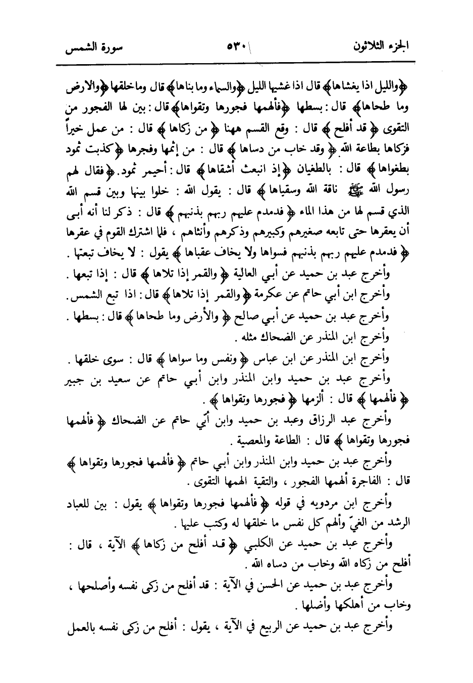 {وَاللَّيْل إِذا يَغْشَاهَا} قَالَ إِذا غشيها اللَّيْل {وَالسَّمَاء وَمَا بناها} قَالَ وَمَا خلقهَا {وَالْأَرْض وَمَا طحاها} قَالَ: بسطها {فألهمها فجورها وتقواها} قَالَ: بَين لَهَا الْفُجُور من التَّقْوَى {قد أَفْلح} قَالَ: وَقع الْقسم هَهُنَا {من زكاها} قَالَ: من عمل خيرا فزكاها بِطَاعَة الله {وَقد خَابَ من دساها} قَالَ: من إثمها وفجرها {كذبت ثَمُود بطغواها} قَالَ: بالطغيان {إِذْ انْبَعَثَ أشقاها} قَالَ: أُحَيْمِر ثَمُود