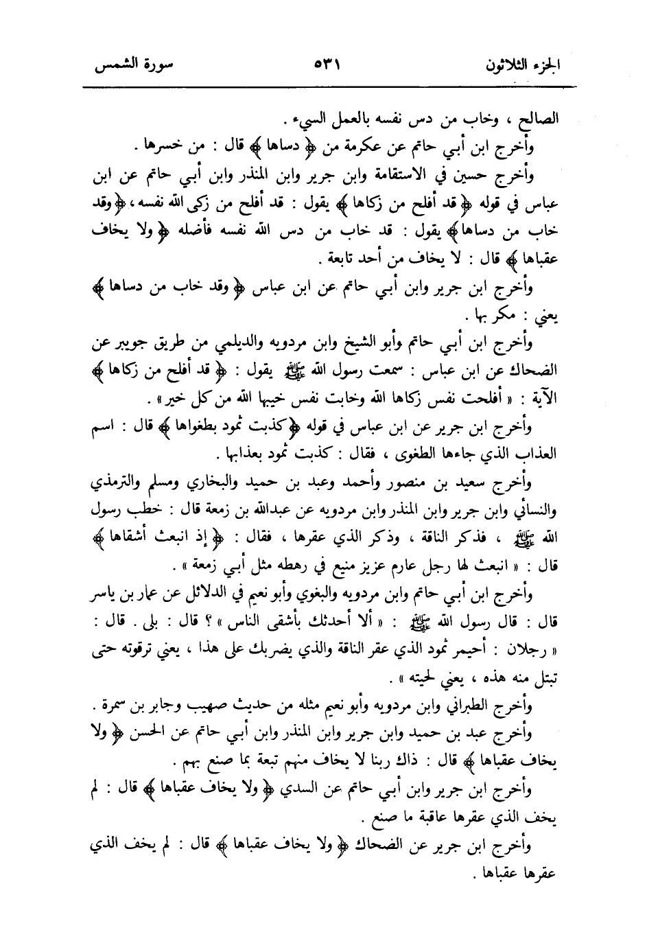 وَأخرج حُسَيْن فِي الاسْتقَامَة وَابْن جرير وَابْن الْمُنْذر وَابْن أبي حَاتِم عَن ابْن عَبَّاس فِي قَوْله: {قد أَفْلح من زكاها} يَقُول: قد أَفْلح من زكى الله نَفسه {وَقد خَابَ من دساها} يَقُول: قد خَابَ من دس الله نَفسه فأضله {وَلَا يخَاف عقباها} قَالَ: لَا يخَاف من أحد تَابعه
