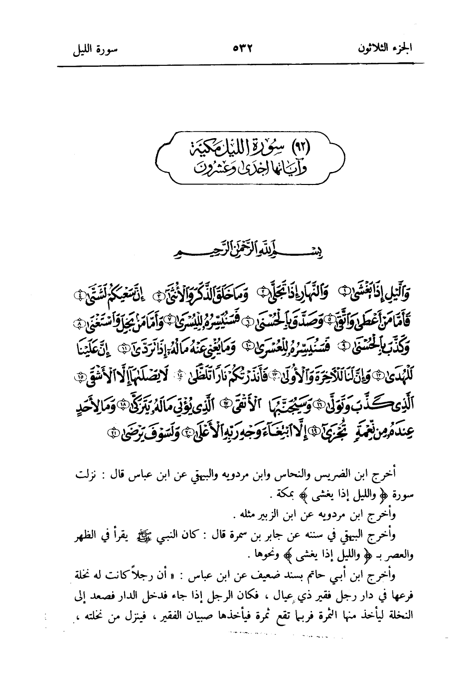 أخرج ابْن الضريس والنحاس وَابْن مرْدَوَيْه وَالْبَيْهَقِيّ عَن ابْن عَبَّاس قَالَ: نزلت سُورَة {وَاللَّيْل إِذا يغشى} بِمَكَّة
