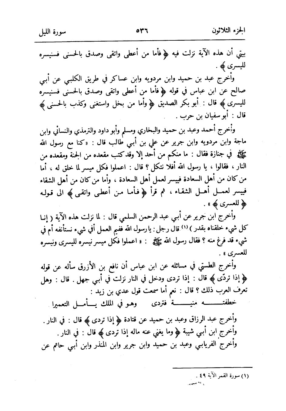 وَأخرج أَحْمد وَعبد بن حميد وَالْبُخَارِيّ وَمُسلم وَأَبُو دَاوُد وَالتِّرْمِذِيّ وَالنَّسَائِيّ وَابْن ماجة وَابْن مرْدَوَيْه وَابْن جرير عَن عَليّ بن أبي طَالب قَالَ: كُنَّا مَعَ رَسُول الله صلى الله عَلَيْهِ وَسلم فِي جَنَازَة فَقَالَ: مَا مِنْكُم من أحد إِلَّا وَقد كتب مَقْعَده من الْجنَّة ومقعده من النَّار فَقَالُوا يَا رَسُول الله أَفلا نَتَّكِل قَالَ: اعْمَلُوا فَكل ميسر لما خلق لَهُ أما من كَانَ من أهل السَّعَادَة فييسر لعمل أهل السَّعَادَة وَأما من كَانَ من أهل الشَّقَاء فييسر لعمل أهل الشَّقَاء ثمَّ قَرَأَ {فَأَما من أعْطى وَاتَّقَى} إِلَى قَوْله: {للعسرى}