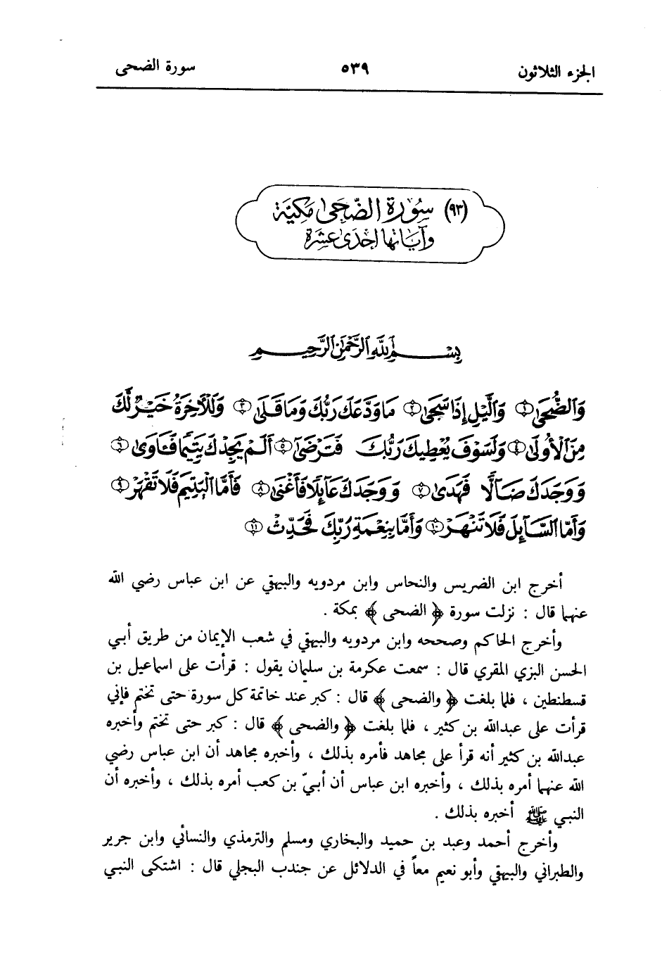 أخرج ابْن الضريس والنحاس وَابْن مرْدَوَيْه وَالْبَيْهَقِيّ عَن ابْن عَبَّاس رَضِي الله عَنْهُمَا قَالَ: نزلت سُورَة الضُّحَى بِمَكَّة