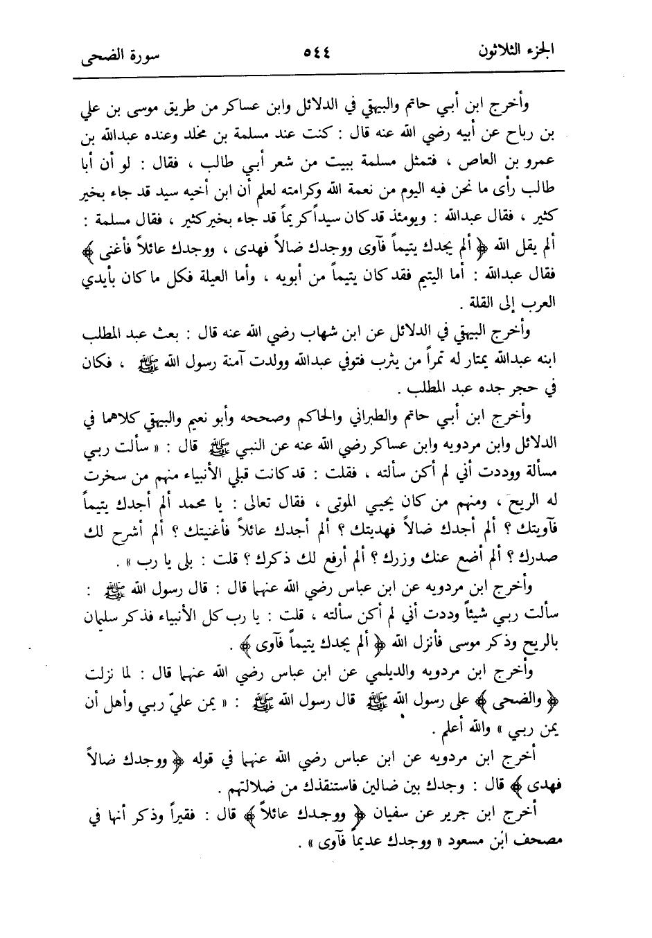 وَأخرج ابْن مرْدَوَيْه عَن ابْن عَبَّاس رَضِي الله عَنْهُمَا فِي قَوْله: {ووجدك ضَالًّا فهدى} قَالَ: وَجدك بَين ضَالِّينَ فاستنقذك من ضلالتهم