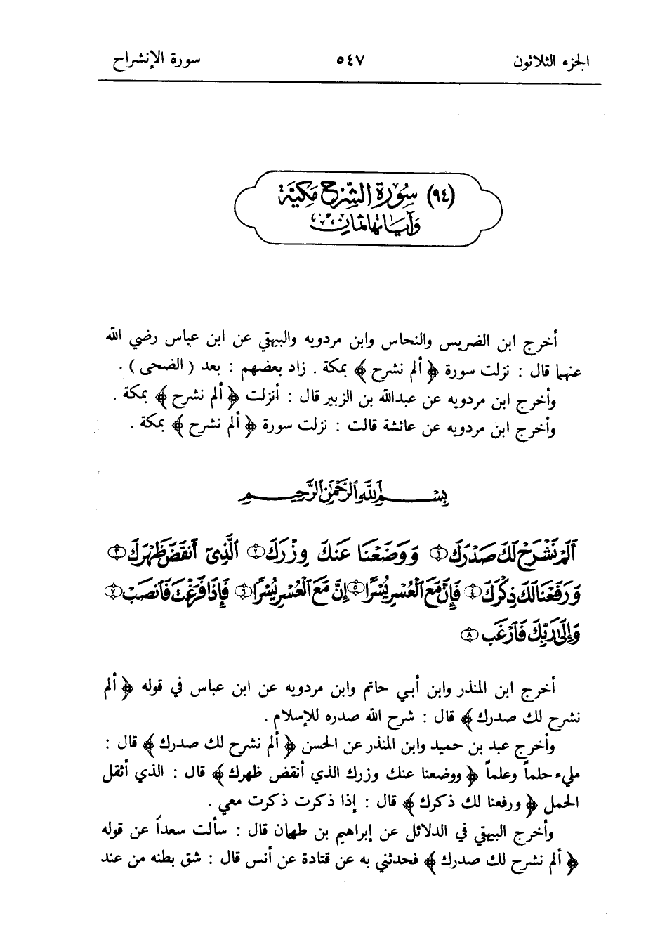 مُقَدّمَة السُّورَة أخرج ابْن الضريس والنحاس وَابْن مرْدَوَيْه وَالْبَيْهَقِيّ عَن ابْن عَبَّاس رَضِي الله عَنْهُمَا قَالَ: نزلت سُورَة {ألم نشرح} بِمَكَّة