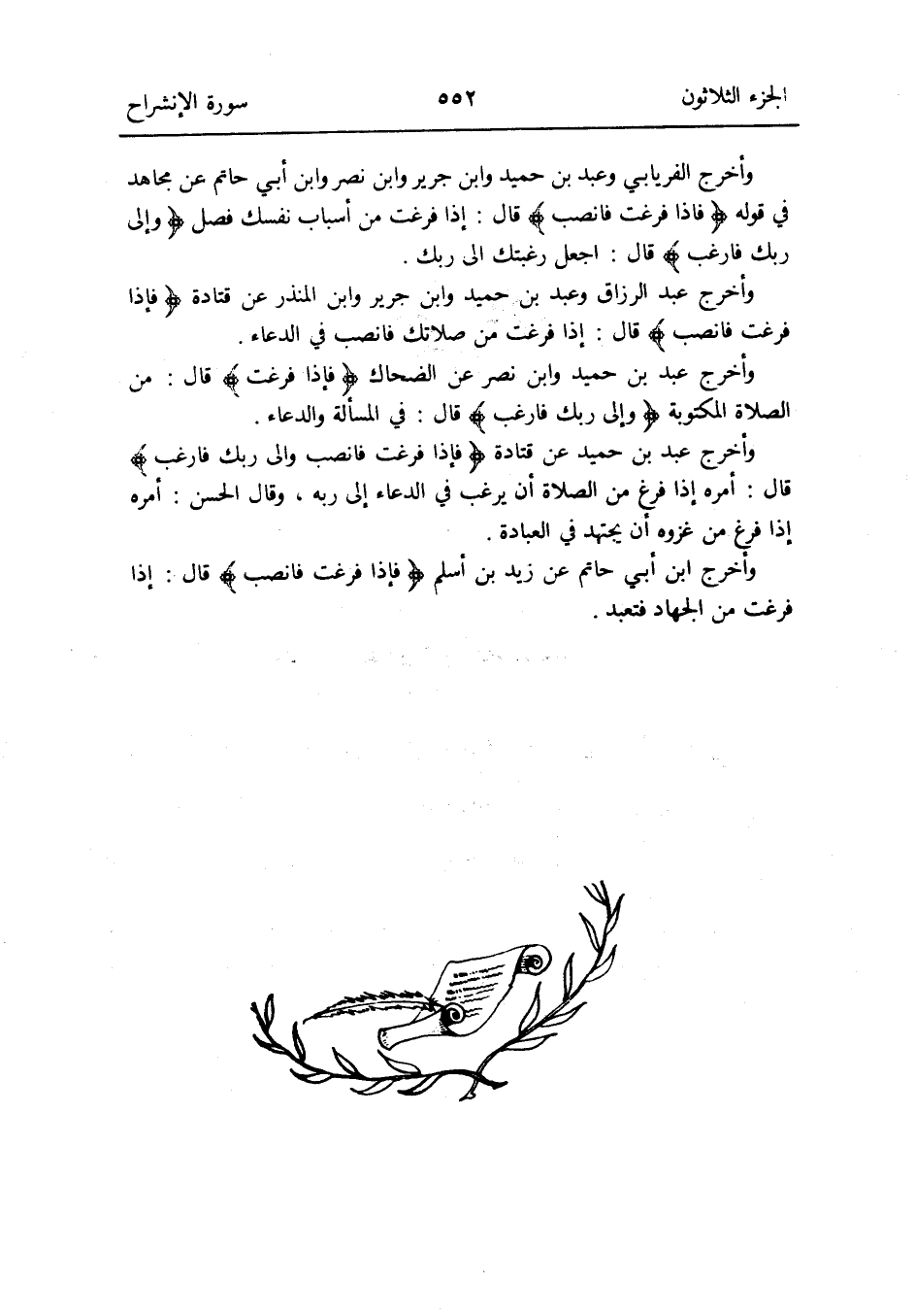 وَأخرج عبد الرَّزَّاق وَعبد بن حميد وَابْن جرير وَابْن الْمُنْذر عَن قَتَادَة {فَإِذا فرغت فانصب} قَالَ: إِذا فرغت من صَلَاتك فانصب فِي الدُّعَاء