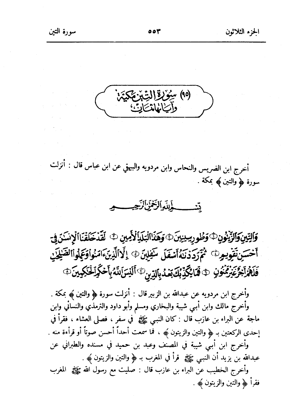 مَكِّيَّة وآياتها ثَمَان أخرج ابْن الضريس والنحاس وَابْن مرْدَوَيْه وَالْبَيْهَقِيّ عَن ابْن عَبَّاس قَالَ: أنزلت سُورَة التِّين {والتين} بِمَكَّة
