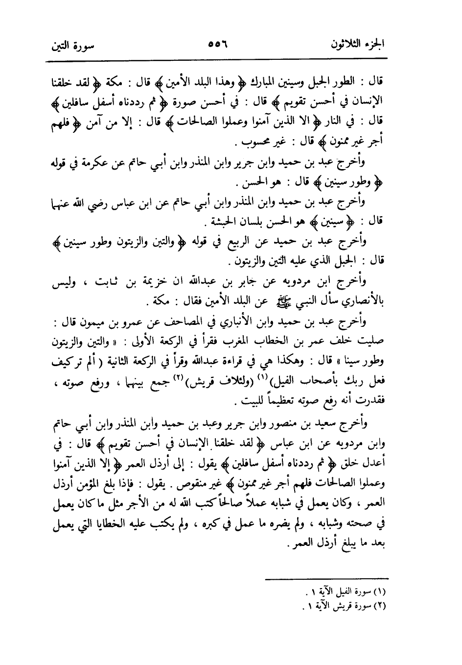 وَأخرج سعيد بن مَنْصُور وَابْن جرير وَعبد بن حميد وَابْن الْمُنْذر وَابْن أبي حَاتِم وَابْن مرْدَوَيْه عَن ابْن عَبَّاس {لقد خلقنَا الإِنسان فِي أحسن تَقْوِيم} قَالَ: فِي أعدل خلق {ثمَّ رددناه أَسْفَل سافلين} يَقُول: إِلَى أرذل الْعُمر {إِلَّا الَّذين آمنُوا وَعمِلُوا الصَّالِحَات فَلهم أجر غير ممنون} غير مَنْقُوص