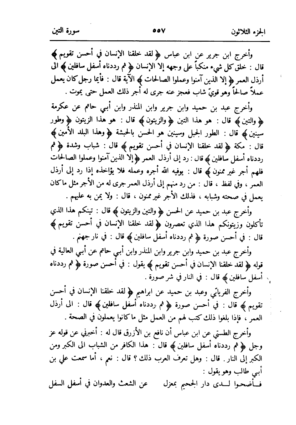 وَأخرج الطستي عَن ابْن عَبَّاس إِن نَافِع بن الْأَزْرَق قَالَ لَهُ: أَخْبرنِي عَن قَوْله: عزَّ وَجل {ثمَّ رددناه أَسْفَل سافلين} قَالَ: هَذَا الْكَافِر من الشَّبَاب إِلَى الْكبر وَمن الْكبر إِلَى النَّار