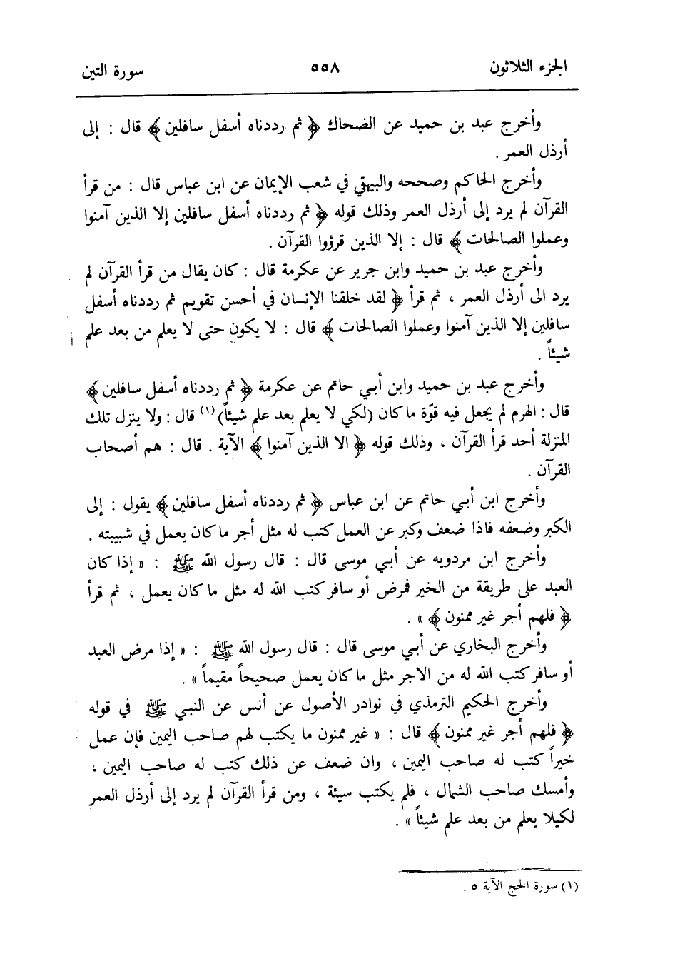 وَأخرج عبد بن حميد وَابْن أبي حَاتِم عَن عِكْرِمَة {ثمَّ رددناه أَسْفَل سافلين} قَالَ: الْهَرم لم يَجْعَل فِيهِ قوّة مَا كَانَ (لكَي لَا يعلم بعد علم شَيْئا) (سُورَة الْحَج الْآيَة 5) قَالَ: وَلَا ينزل تِلْكَ الْمنزلَة أحد قَرَأَ الْقُرْآن وَذَلِكَ قَوْله: {إِلَّا الَّذين آمنُوا} الْآيَة