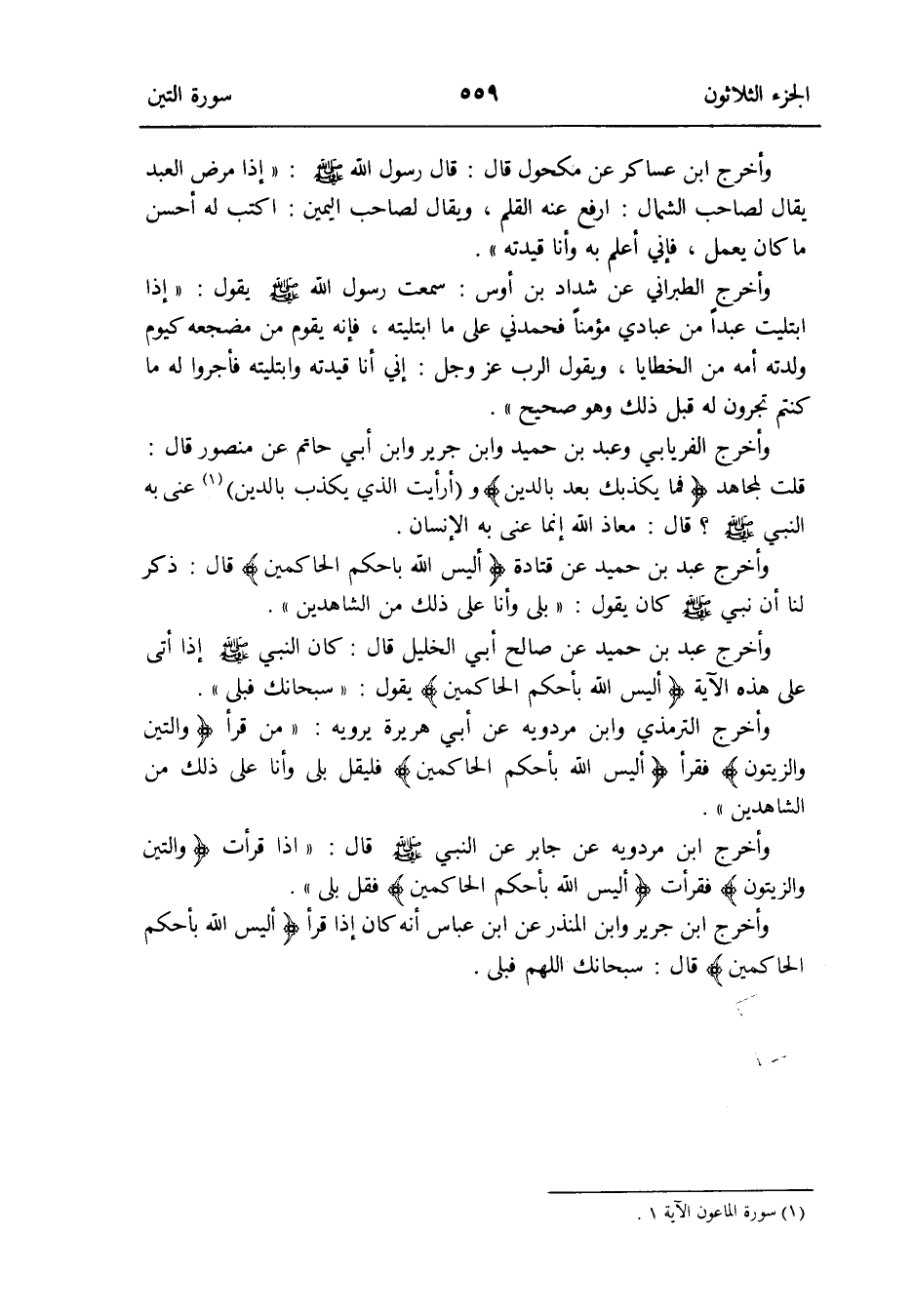 وَأخرج التِّرْمِذِيّ وان مرْدَوَيْه عَن أبي هُرَيْرَة يرويهِ: من قَرَأَ {والتين وَالزَّيْتُون} فَقَرَأَ {أَلَيْسَ الله بِأَحْكَم الْحَاكِمين} فَلْيقل بلَى وَأَنا على ذَلِك من الشَّاهِدين