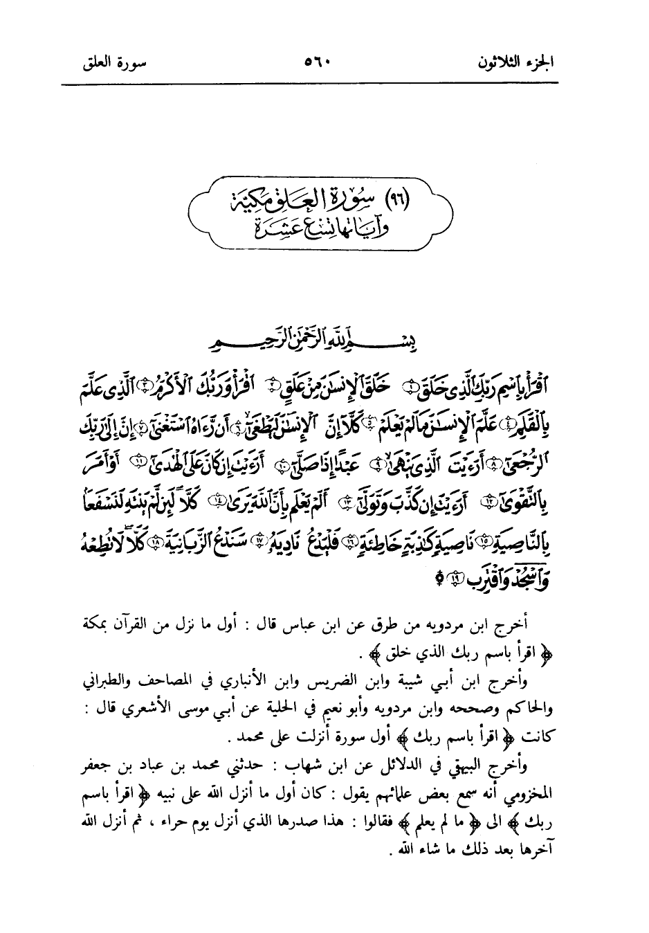 أخرج ابْن مرْدَوَيْه من طرق عَن ابْن عَبَّاس قَالَ: أول مَا نزل من الْقُرْآن بِمَكَّة {اقْرَأ باسم رَبك الَّذِي خلق}