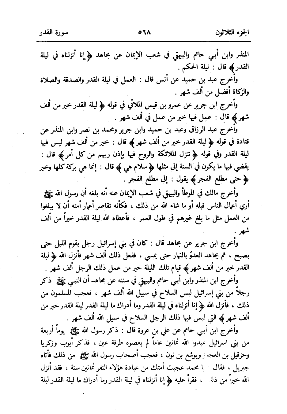 وَأخرج ابْن جرير عَن مُجَاهِد قَالَ: كَانَ فِي بني إِسْرَائِيل رجل يقوم اللَّيْل حَتَّى يصبح ثمَّ يُجَاهد العدوّ بِالنَّهَارِ حَتَّى يُمْسِي فَفعل ذَلِك ألف شهر فَأنْزل الله {لَيْلَة الْقدر خير من ألف شهر} قيام تِلْكَ اللَّيْلَة خير من عمل ذَلِك الرجل ألف شهر
