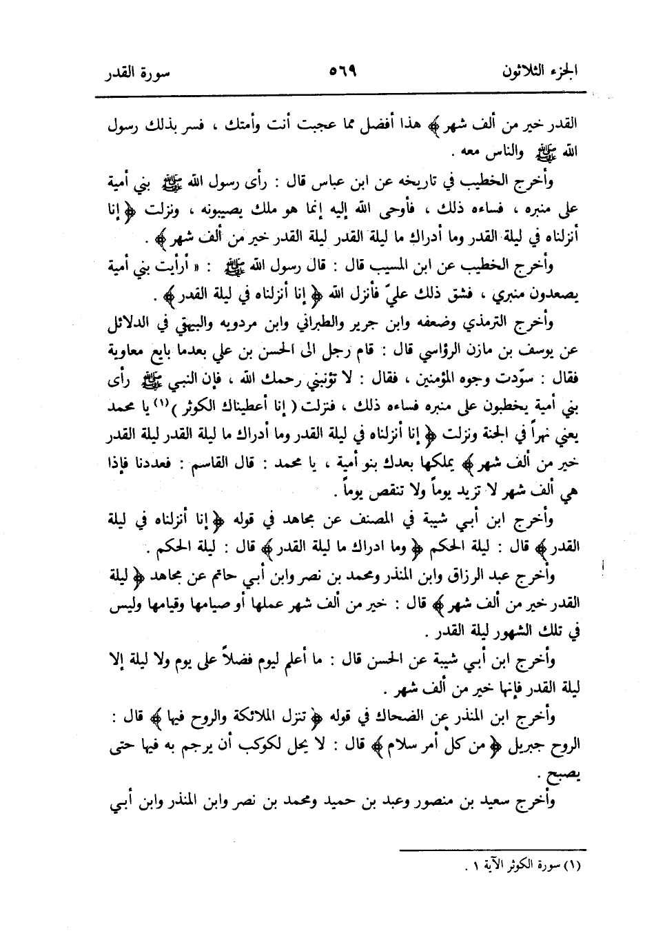 وَأخرج التِّرْمِذِيّ وَضَعفه وَابْن جرير وَالطَّبَرَانِيّ وَابْن مرْدَوَيْه وَالْبَيْهَقِيّ فِي الدَّلَائِل عَن يُوسُف بن مَازِن الرُّؤَاسِي قَالَ: قَامَ رجل إِلَى الْحسن بن عَليّ بعد مَا بَايع مُعَاوِيَة فَقَالَ: سوّدت وُجُوه الْمُؤمنِينَ فَقَالَ: لَا تؤنبني رَحِمك الله فَإِن النَّبِي صلى الله عَلَيْهِ وَسلم رأى بني أُميَّة يخطبون على منبره فساءه ذَلِك فَنزلت (إِنَّا أعطيناك الْكَوْثَر) (سُورَة الْكَوْثَر الْآيَة 1) يَا مُحَمَّد يَعْنِي نَهرا فِي الْجنَّة وَنزلت {إِنَّا أَنزَلْنَاهُ فِي لَيْلَة الْقدر وَمَا أَدْرَاك مَا لَيْلَة الْقدر لَيْلَة الْقدر خير من ألف شهر} يملكهَا بعْدك بَنو أُميَّة يَا مُحَمَّد: قَالَ الْقَاسِم: فعددنا فَإِذا هِيَ ألف شهر لَا تزيد يَوْمًا وَلَا تنقص يَوْمًا