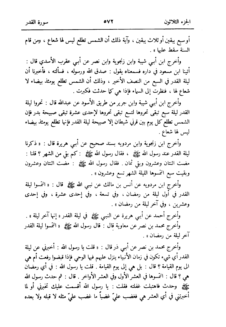 وَأخرج ابْن أبي شيبَة وَابْن زنجوية وَابْن نصر عَن أبي عقرب الْأَسدي قَالَ: أَتَيْنَا ابْن مَسْعُود فِي دَاره فسمعناه يَقُول: صدق الله وَرَسُوله فَسَأَلته فَأخْبرنَا أَن لَيْلَة الْقدر فِي السَّبع من النّصْف الْأَخير وَذَلِكَ أَن الشَّمْس تطلع يَوْمئِذٍ بَيْضَاء لَا شُعَاع لَهَا فَنَظَرت إِلَى السَّمَاء فَإِذا هِيَ كَمَا حدثت فكبرت