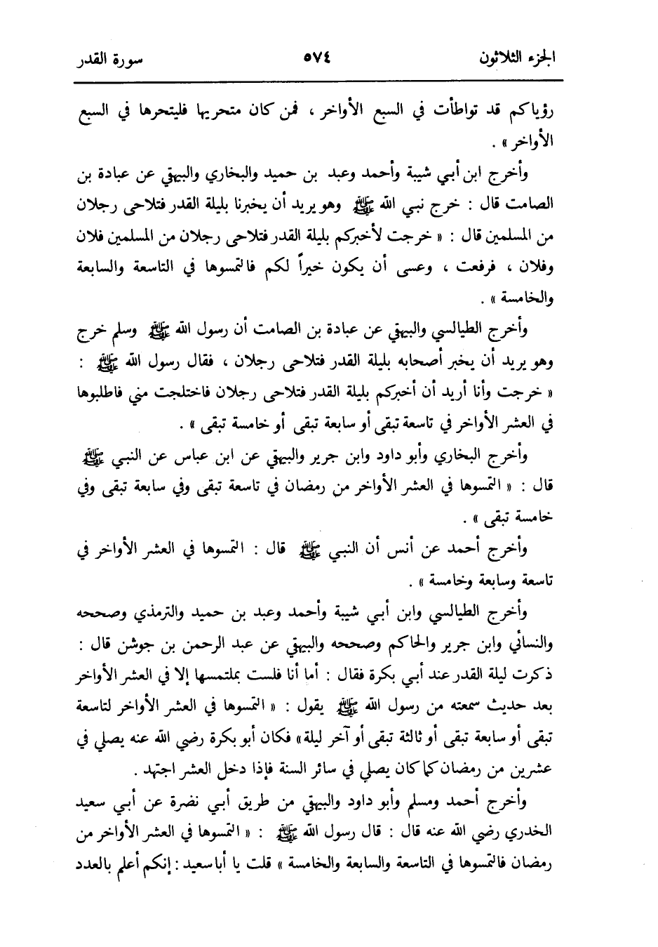 وَأخرج الطَّيَالِسِيّ وَابْن أبي شيبَة وَأحمد وَعبد بن حميد وَالتِّرْمِذِيّ وَصَححهُ وَالنَّسَائِيّ وَابْن جرير وَالْحَاكِم وَصَححهُ وَالْبَيْهَقِيّ عَن عبد الرَّحْمَن بن جوشن قَالَ: ذكرت لَيْلَة الْقدر عِنْد أبي بكرَة فَقَالَ: أما أَنا فلست بملتمسها إِلَّا فِي الْعشْر الْأَوَاخِر بعد حَدِيث سمعته من رَسُول الله صلى الله عَلَيْهِ وَسلم يَقُول: التمسوها فِي الْعشْر الْأَوَاخِر لتاسعة تبقى أَو سابعة تبقى أَو ثَالِثَة تبقى أَو آخر لَيْلَة فَكَانَ أَبُو بكرَة رَضِي الله عَنهُ يُصَلِّي فِي عشْرين من رَمَضَان كَمَا كَانَ يُصَلِّي فِي سَائِر السّنة فَإِذا دخل الْعشْر اجْتهد