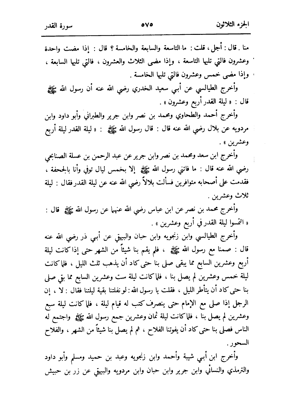 وَأخرج الطَّيَالِسِيّ وَابْن زَنْجوَيْه وَابْن حبَان وَالْبَيْهَقِيّ عَن أبي ذَر رَضِي الله عَنهُ قَالَ: صمنا مَعَ رَسُول الله صلى الله عَلَيْهِ وَسلم فَلم يقم بِنَا شَيْئا من الشَّهْر حَتَّى إِذا كَانَت لَيْلَة أَربع وَعشْرين السَّابِع مِمَّا يبْقى صلى بِنَا حَتَّى كَاد أَن يذهب ثلث اللَّيْل فَلَمَّا كَانَت لَيْلَة خمس وَعشْرين لم يصل بِنَا فَلَمَّا كَانَت لَيْلَة سِتّ وَعشْرين السَّابِع مِمَّا بَقِي صلى بِنَا حَتَّى كَاد أَن يتأطر اللَّيْل فَقلت يَا رَسُول الله: لَو نفلتنا بَقِيَّة ليلتنا فَقَالَ: لَا إِن الرجل إِذا صلى مَعَ الإِمام حَتَّى ينْصَرف كتب لَهُ قيام لَيْلَة فلماكانت لَيْلَة سبع وَعشْرين لم يصل بِنَا فَلَمَّا كَانَت لَيْلَة ثَمَان وَعشْرين جمع رَسُول الله صلى الله عَلَيْهِ وَسلم وَاجْتمعَ لَهُ النَّاس فصلى بِنَا حَتَّى كَاد أَن يفوتنا الْفَلاح ثمَّ لم يصل بِنَا شَيْئا من الشَّهْر والفلاح السّحُور