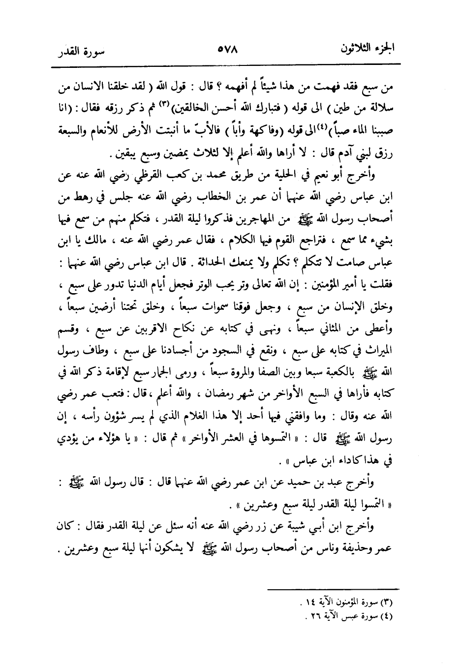 وَأخرج أَبُو نعيم فِي الْحِلْية من طَرِيق مُحَمَّد بن كَعْب الْقرظِيّ رَضِي الله عَنهُ عَن ابْن عَبَّاس رَضِي الله عَنْهُمَا أَن عمر بن الْخطاب رَضِي الله عَنهُ جلس فِي رَهْط من أَصْحَاب رَسُول الله صلى الله عَلَيْهِ وَسلم من الْمُهَاجِرين فَذكرُوا لَيْلَة الْقدر فَتكلم مِنْهُم من سمع فِيهَا بِشَيْء مِمَّا سمع فتراجع الْقَوْم فِيهَا الْكَلَام فَقَالَ عمر رَضِي الله عَنهُ مَالك يَا ابْن عَبَّاس صَامت لَا تَتَكَلَّم تكلم وَلَا يمنعك الحداثة