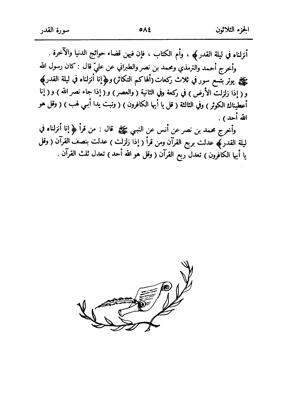 وَأخرج أَحْمد وَالتِّرْمِذِيّ وَمُحَمّد بن نصر وَالطَّبَرَانِيّ عَن عَليّ قَالَ: كَانَ رَسُول الله صلى الله عَلَيْهِ وَسلم يُوتر بتسع سور فِي ثَلَاث رَكْعَات (أَلْهَاكُم التكاثر) و {إِنَّا أَنزَلْنَاهُ فِي لَيْلَة الْقدر} و (إِذا زلزلت الأَرْض) فِي رَكْعَة وَفِي الثَّانِيَة (وَالْعصر) و (إِذا جَاءَ نصر الله) و (إِنَّا أعطيناك الْكَوْثَر) وَفِي الثَّالِثَة (قل يَا أَيهَا الْكَافِرُونَ) (وتبت يدا أبي لَهب) (وَقل هُوَ الله أحد) وَأخرج مُحَمَّد بن نصر عَن أنس عَن النَّبِي صلى الله عَلَيْهِ وَسلم قَالَ: من قَرَأَ {إِنَّا أَنزَلْنَاهُ فِي لَيْلَة الْقدر} عدلت بِربع الْقُرْآن وَمن قَرَأَ (إِذا زلزلت) عدلت بِنصْف الْقُرْآن (وَقل يَا أَيهَا الْكَافِرُونَ) تعدل ربع الْقُرْآن (وَقل هُوَ الله أحد) تعدل ثلث الْقُرْآن
