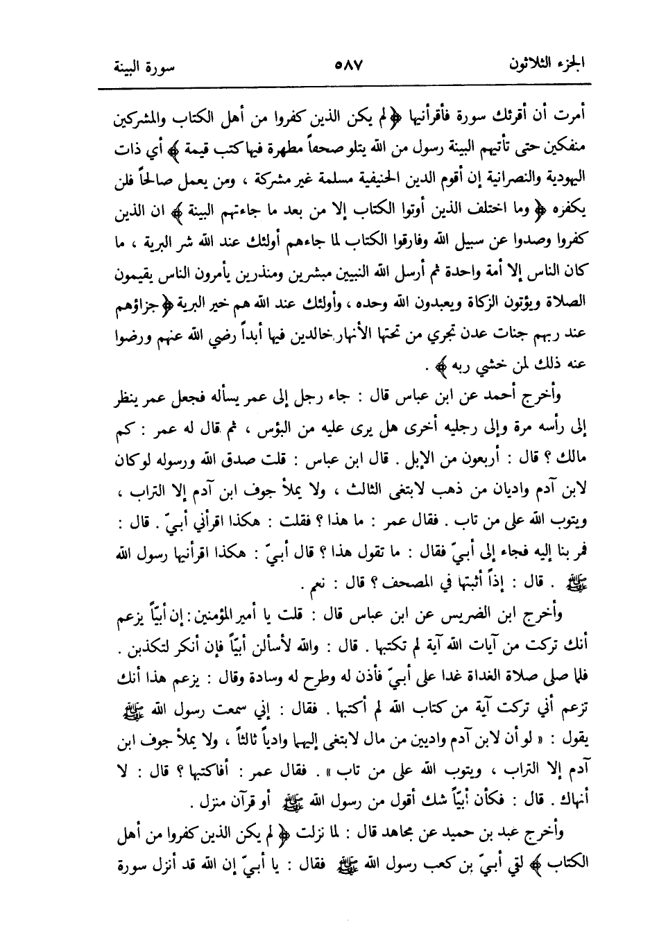 أمرت أَن أقرئك سُورَة فأقرأنيها {لم يكن الَّذين كفرُوا من أهل الْكتاب وَالْمُشْرِكين منفكين حَتَّى تأتيهم الْبَيِّنَة رَسُول من الله يَتْلُو صحفاً مطهرة فِيهَا كتب قيمَة} أَي ذَات الْيَهُودِيَّة والنصرانية إِن أقوم الدّين الحنيفية مسلمة غير مُشركَة وَمن يعْمل صَالحا فَلَنْ يكفره {وَمَا تفرق الَّذين أُوتُوا الْكتاب إِلَّا من بعد مَا جَاءَتْهُم الْبَيِّنَة} إِن الَّذين كفرُوا وصدوا عَن سَبِيل الله وفارقوا الْكتاب لما جَاءَهُم أُولَئِكَ عِنْد الله شَرّ الْبَريَّة مَا كَانَ النَّاس إِلَّا أمة وَاحِدَة ثمَّ أرسل الله النَّبِيين مبشرين ومنذرين يأمرون النَّاس يُقِيمُونَ الصَّلَاة وَيُؤْتونَ الزَّكَاة ويعبدون الله وَحده وَأُولَئِكَ عِنْد الله هم خير الْبَريَّة {جزاؤهم عِنْد رَبهم جنَّات عدن تجْرِي من تحتهَا الْأَنْهَار خَالِدين فِيهَا أبدا رَضِي الله عَنْهُم وَرَضوا عَنهُ ذَلِك لمن خشِي ربه}