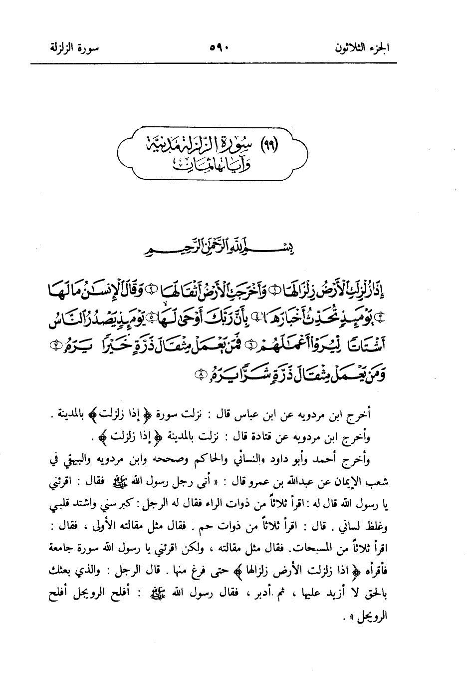 أخرج ابْن مرْدَوَيْه عَن ابْن عَبَّاس قَالَ: نزلت سُورَة {إِذا زلزلت} بِالْمَدِينَةِ