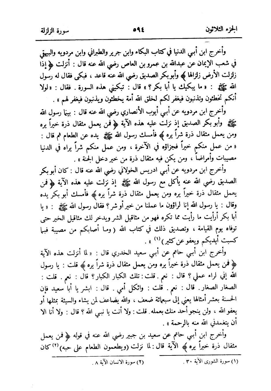 وَأخرج ابْن مرْدَوَيْه عَن أبي إِدْرِيس الْخَولَانِيّ رَضِي الله عَنهُ قَالَ: كَانَ أَبُو بكر الصّديق رَضِي الله عَنهُ يَأْكُل مَعَ رَسُول الله صلى الله عَلَيْهِ وَسلم إِذْ نزلت عَلَيْهِ هَذِه الْآيَة {فَمن يعْمل مِثْقَال ذرة خيرا يره وَمن يعْمل مِثْقَال ذرة شرا يره} فَأمْسك أَبُو بكر يَده وَقَالَ: يَا رَسُول الله إِنَّا لراؤون مَا عَملنَا من خير أَو شرا فَقَالَ رَسُول الله صلى الله عَلَيْهِ وَسلم: يَا أَبَا بكر أَرَأَيْت مَا رَأَيْت مِمَّا تكره فَهُوَ من مَثَاقِيل الشَّرّ ويدخر لَك مَثَاقِيل الْخَيْر حَتَّى توفاه يَوْم الْقِيَامَة وتصديق ذَلِك فِي كتاب الله (وَمَا أَصَابَكُم من مُصِيبَة فبمَا كسبت أَيْدِيكُم وَيَعْفُو عَن كثير) (سُورَة الشورى الْآيَة 30)