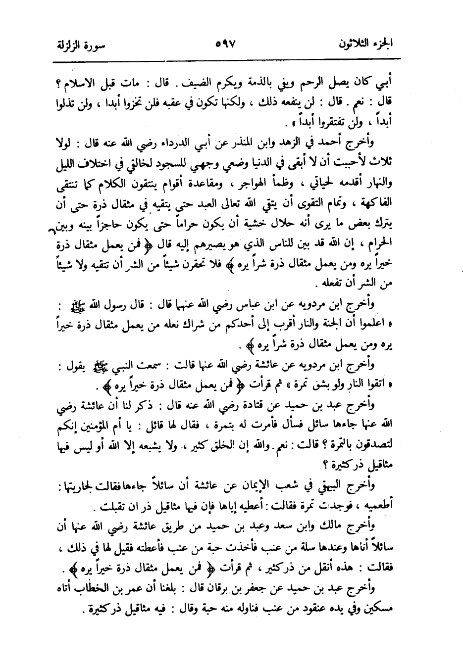 وَأخرج أَحْمد فِي الزّهْد وَابْن الْمُنْذر عَن أبي الدَّرْدَاء رَضِي الله عَنهُ قَالَ: لَوْلَا ثَلَاث لأحببت أَن لَا أبقى فِي الدُّنْيَا وضعي وَجْهي للسُّجُود لخالقي فِي اخْتِلَاف اللَّيْل وَالنَّهَار أقدمه لحياتي وظمأ الهواجر ومقاعدة أَقوام ينتقون الْكَلَام كَمَا تنتقى الْفَاكِهَة وَتَمام التَّقْوَى أَن يَتَّقِي الله تَعَالَى الْبعد حَتَّى يتقيه فِي مِثْقَال ذرة حَتَّى أَن يتْرك بعض مَا يرى أَنه حَلَال خشيَة أَن يكون حَرَامًا حَتَّى يكون حاجزاً بَينه وَبَين الْحَرَام إِن الله قد بَين للنَّاس الَّذِي هُوَ يصيرهم إِلَيْهِ قَالَ: {فَمن يعْمل مِثْقَال ذرة خيرا يره وَمن يعْمل مِثْقَال ذرة شرا يره} فَلَا تحقرن شَيْئا من الشَّرّ أَن تتقيه وَلَا شَيْئا من الشَّرّ أَن تَفْعَلهُ