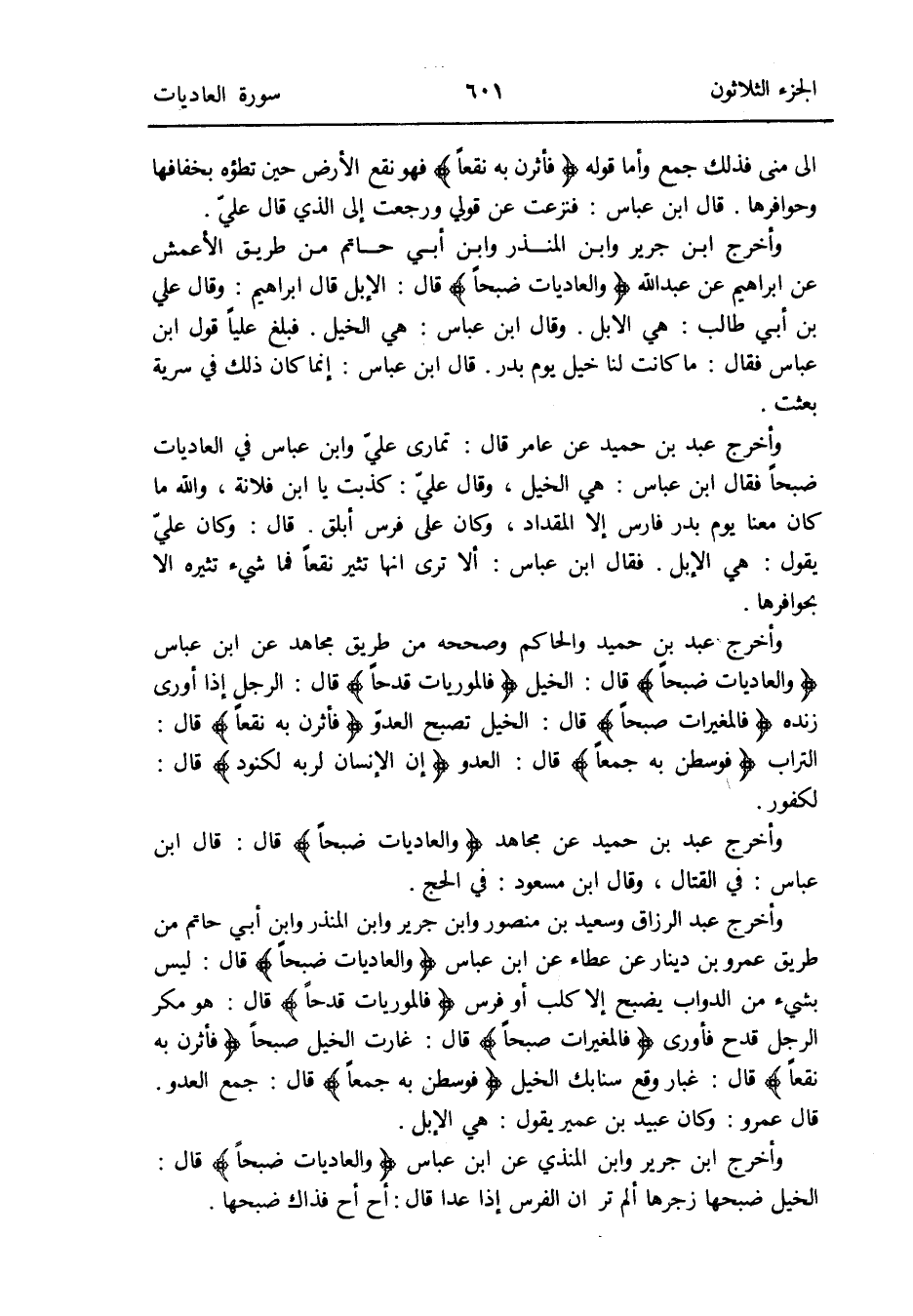 وَأخرج عبد الرَّزَّاق وَسَعِيد بن مَنْصُور وَابْن جرير وَابْن الْمُنْذر وَابْن أبي حَاتِم من طَرِيق عَمْرو بن دِينَار عَن عَطاء عَن ابْن عَبَّاس {وَالْعَادِيات ضَبْحًا} قَالَ: لَيْسَ بِشَيْء من الدَّوَابّ يضبح إِلَّا كلب أَو فرس {فالموريات قدحاً} قَالَ: هُوَ مكر الرجل قدح فأورى {فالمغيرات صبحاً} قَالَ: غارت الْخَيل صبحاً {فأثرن بِهِ نقعاً} قَالَ: غُبَار وَقع سنابك الْخَيل {فوسطن بِهِ جمعا} قَالَ: جمع الْعَدو
