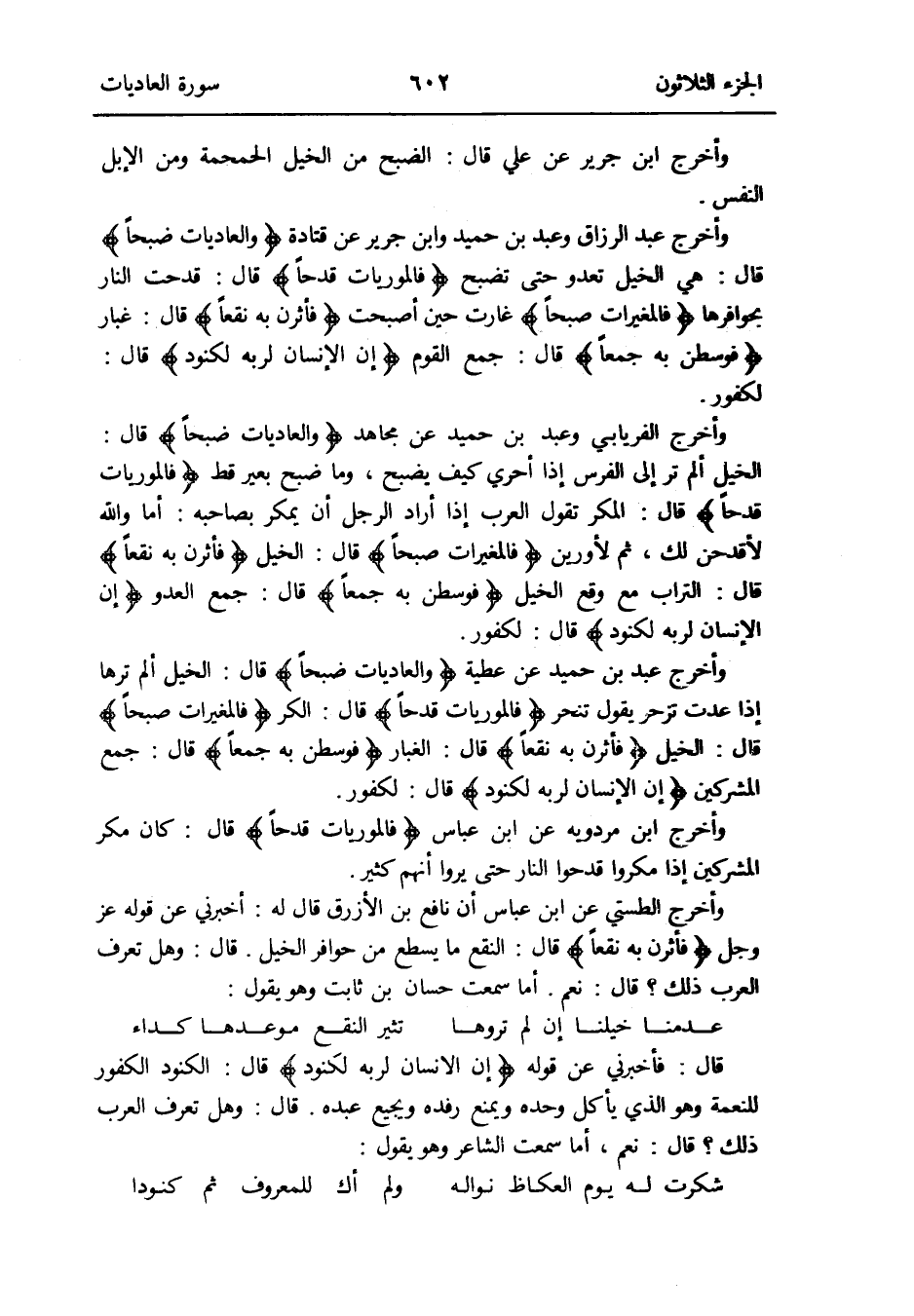 وَأخرج عبد الرَّزَّاق وَعبد بن حميد وَابْن جرير عَن قَتَادَة {وَالْعَادِيات ضَبْحًا} قَالَ: هِيَ الْخَيل تعدو حَتَّى تضبح {فالموريات قدحاً} قَالَ: قدحت النَّار بحوافرها {فالمغيرات صبحاً} غارت حِين أَصبَحت {فأثرن بِهِ نقعاً} قَالَ: غُبَار {فوسطن بِهِ جمعا} قَالَ: جمع الْقَوْم {إِن الإِنسان لرَبه لكنود} قَالَ: لكفور