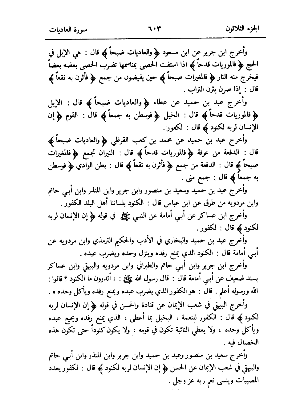 وَأخرج عبد بن حميد عَن مُحَمَّد بن كَعْب الْقرظِيّ {وَالْعَادِيات ضَبْحًا} قَالَ: الدفعة من عَرَفَة {فالموريات قدحاً} قَالَ: النيرَان تجمع {فالمغيرات صبحاً} قَالَ: الدفعة من جمع {فأثرن بِهِ نقعاً} قَالَ: بطن الْوَادي {فوسطن بِهِ جمعا} قَالَ: جمع منى وَأخرج عبد بن حميد وَسَعِيد بن مَنْصُور وَابْن جرير وَابْن الْمُنْذر وَابْن أبي حَاتِم وَابْن مرْدَوَيْه من طرق عَن ابْن عَبَّاس قَالَ: الكنود بلساننا أهل الْبَلَد الكفور